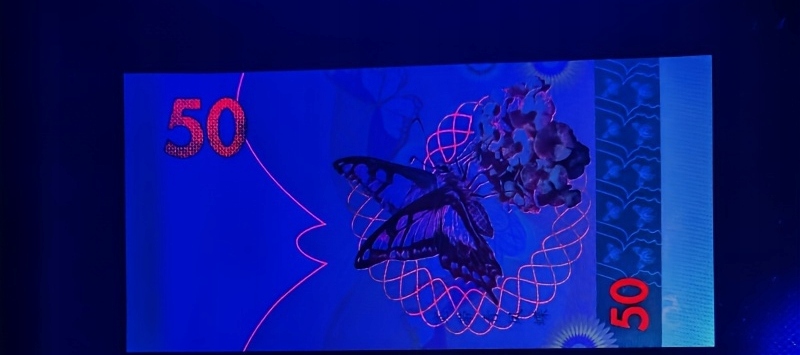 .Реверс: изображены разноцветные бабочки и цветы. Номинал «50» размещен в двух углах банкноты.