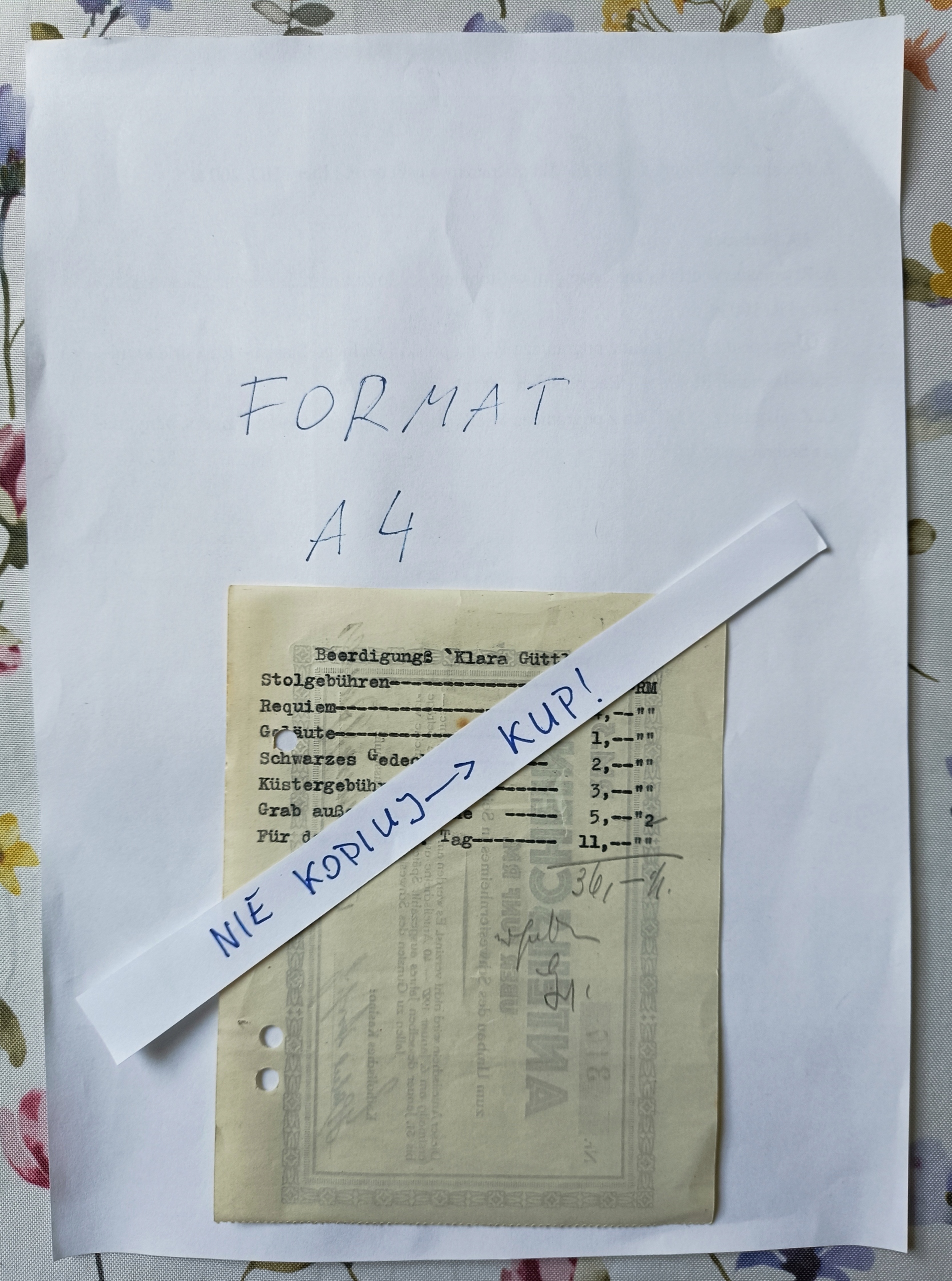 Следы дырокола. Номер 317. На обороте напечатанный текст, не имеющий отношения к лотерее, — список сборов на похороны Клары Гуттлер. Благодаря тому, что священник записал плату на обороте в 1944 году, квитанция сохранилась до наших дней в папке.