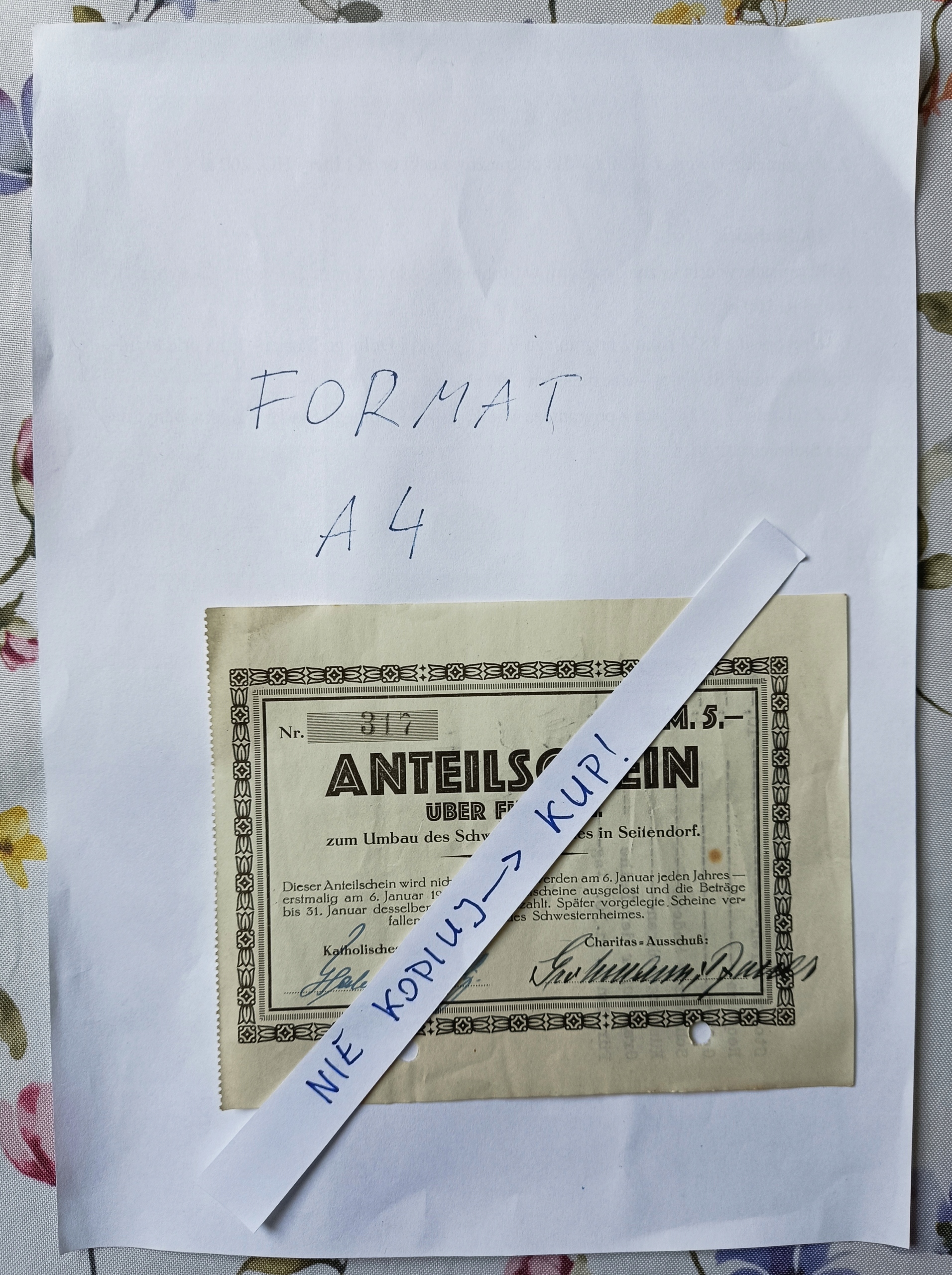 Квитанция размером с открытку - пронумерованный АКЦИОННЫЙ СЕРТИФИКАТ на 5 марок на ремонт дома медсестер (буквально: сестер, а может быть и монахинь) в Зайтендорфе (сегодня Мыслов в Яворском повяте, гмина Болкув). Как гласит надпись, сертификат не приносил процентов. Впервые 6 января 1927 года ежегодно разыгрывалось 40 акций, а выплаты должны были производиться до 31 января того же года. Все ваучеры, предъявленные после этого, будут конфискованы в пользу дома престарелых. Две рукописные подписи организаторов: за Католическое казино и Благотворительный комитет.