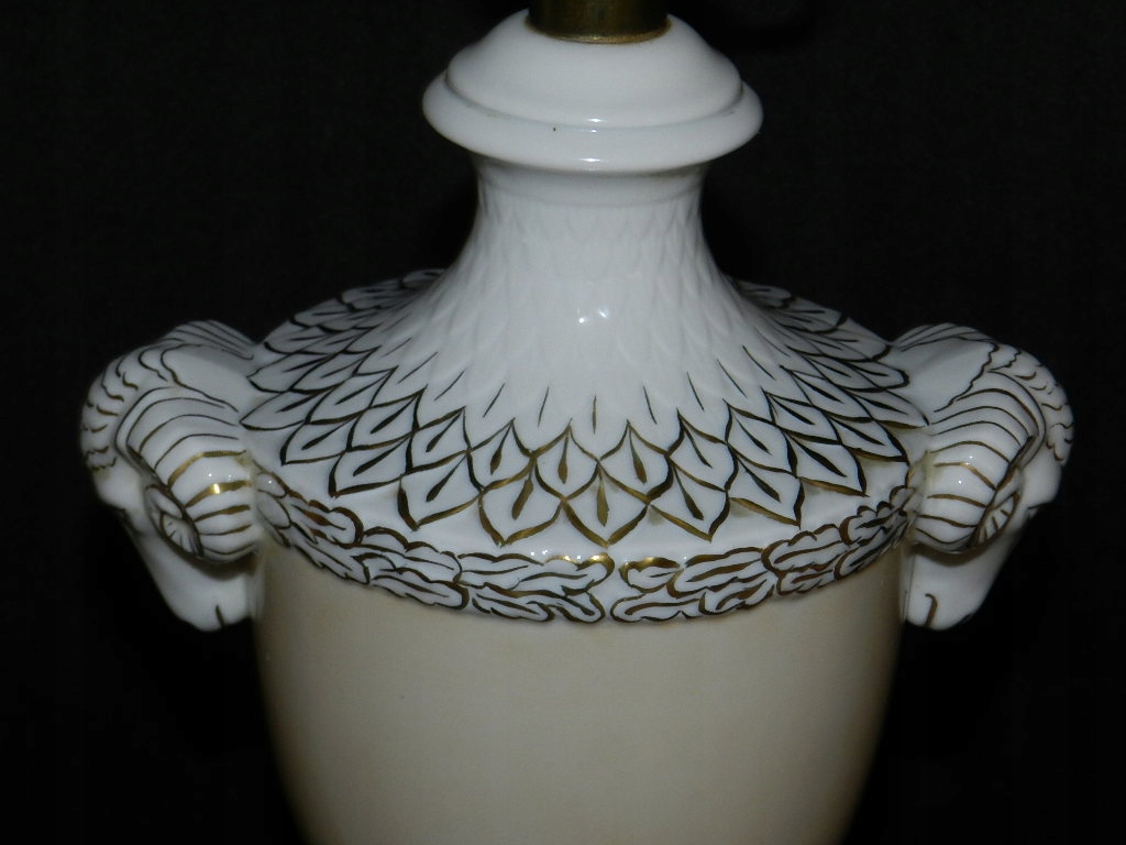 Заслуживает особого внимания. — красивая фарфоровая основа в форме вазы с многочисленными рельефами и тиснением в виде полос и цветочных мотивов, подчеркнутых качественным позолотой.