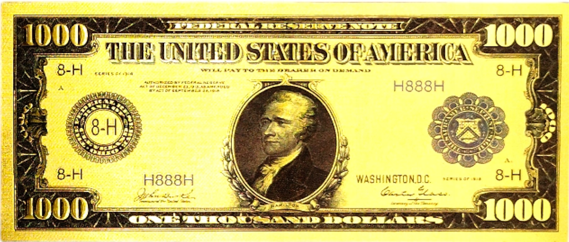 Унікальна позолочена банкнота 1000 ДОЛАРІВ 1918 року