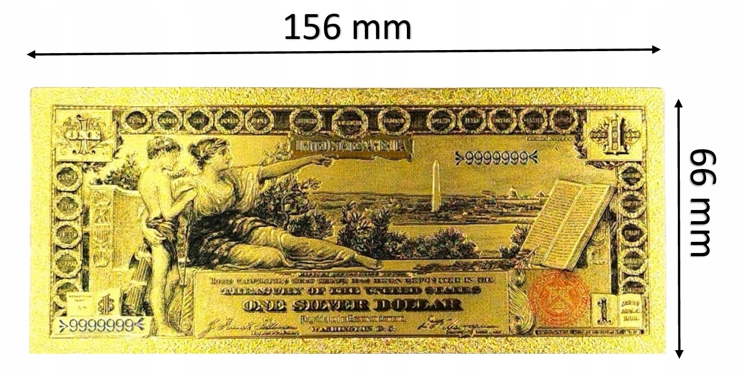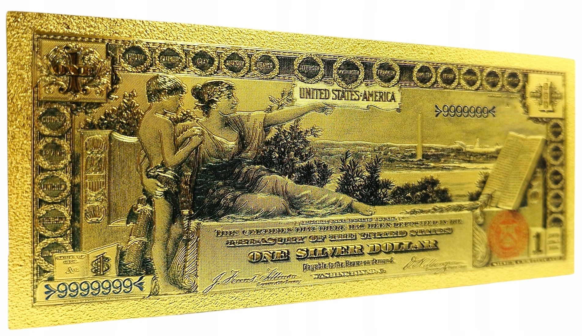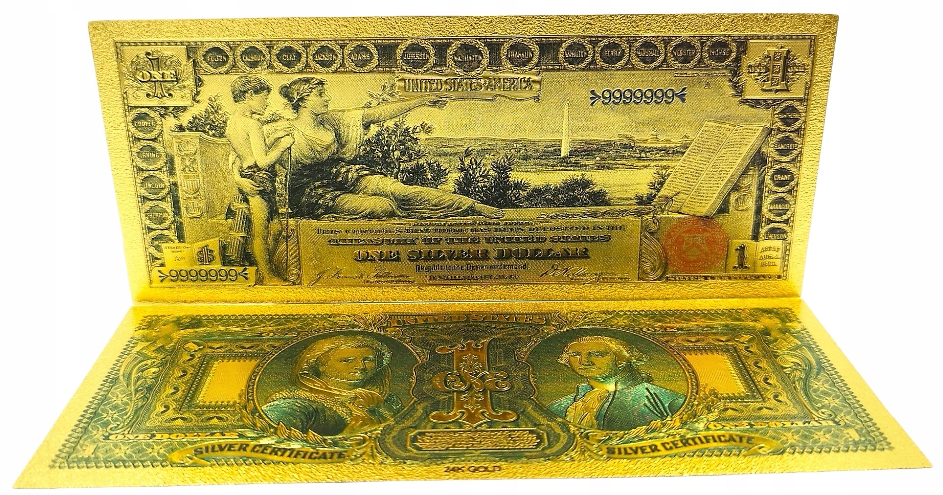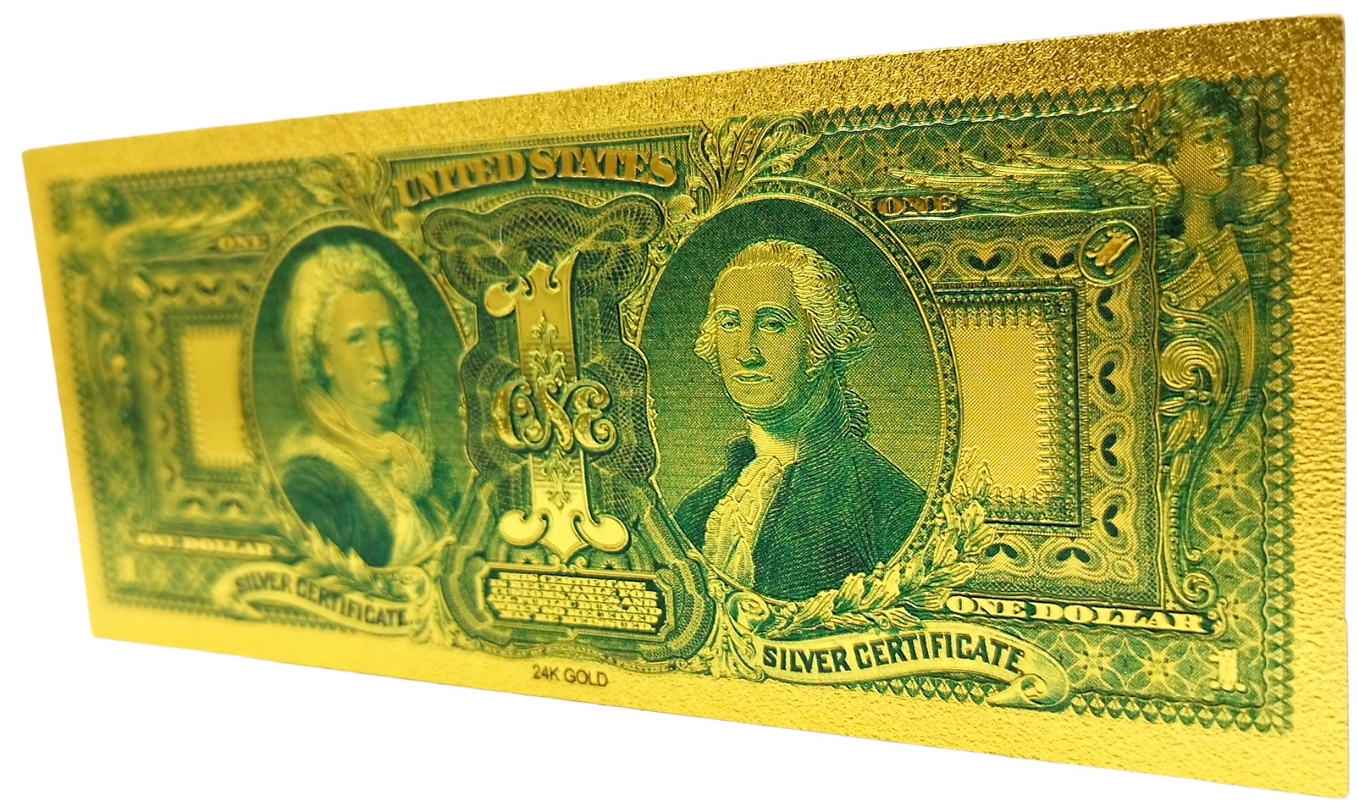 Точная копия исторической банкноты США, изготовленная из ПВХ и покрытая золотой фольгой.