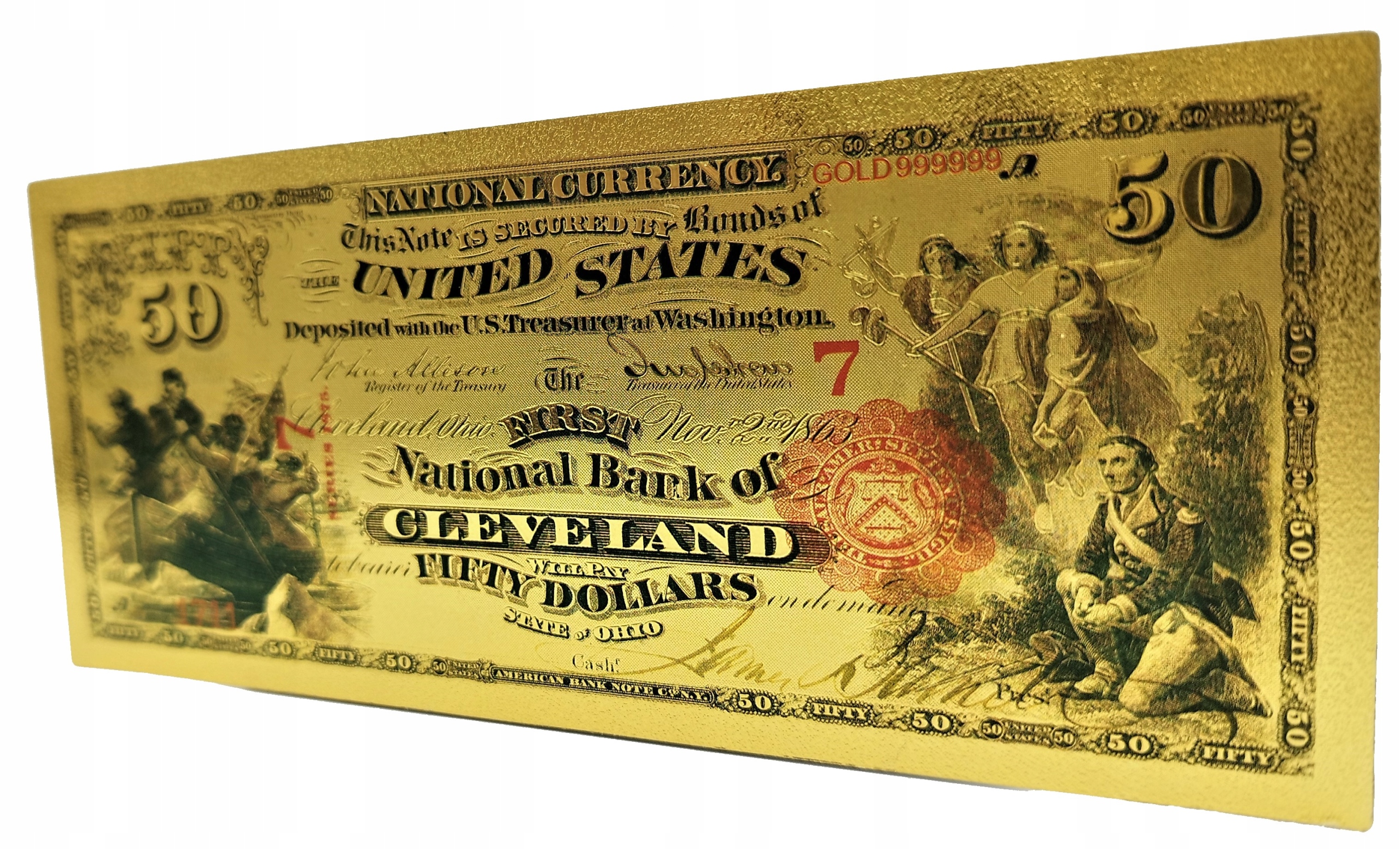 Точная копия американской банкноты первой серии 1875 года, изготовленная из ПВХ и покрыта золотой фольгой.
