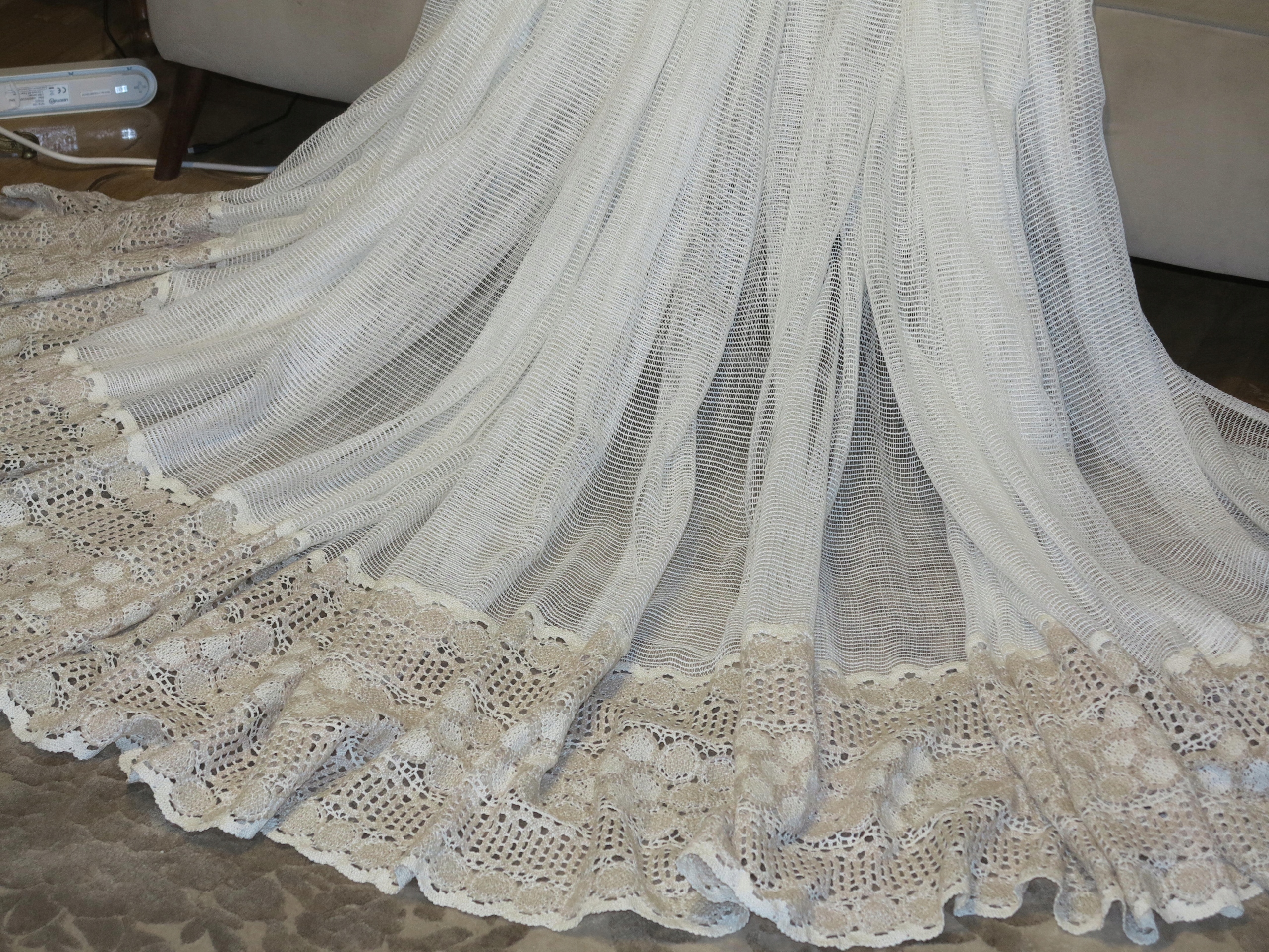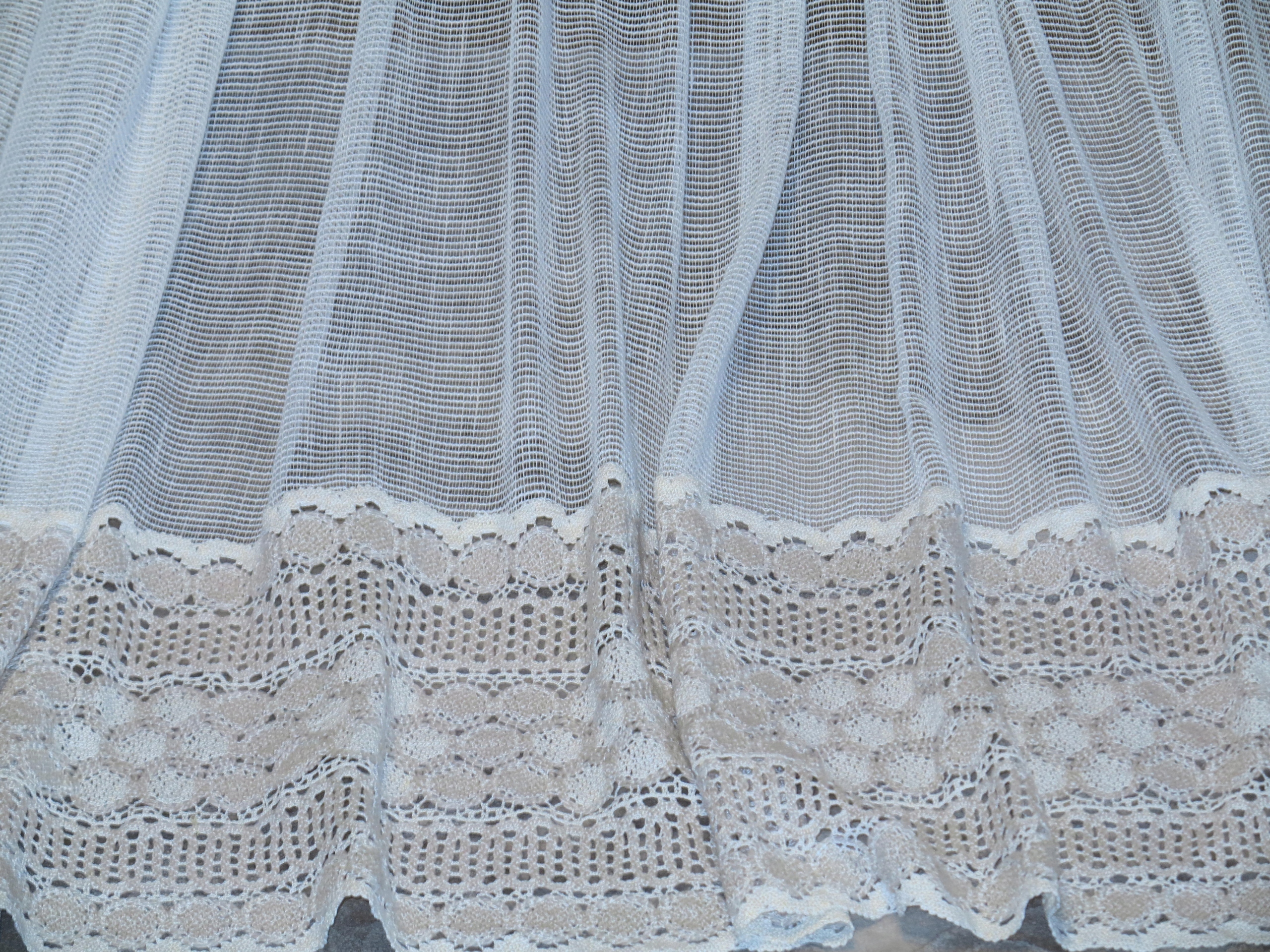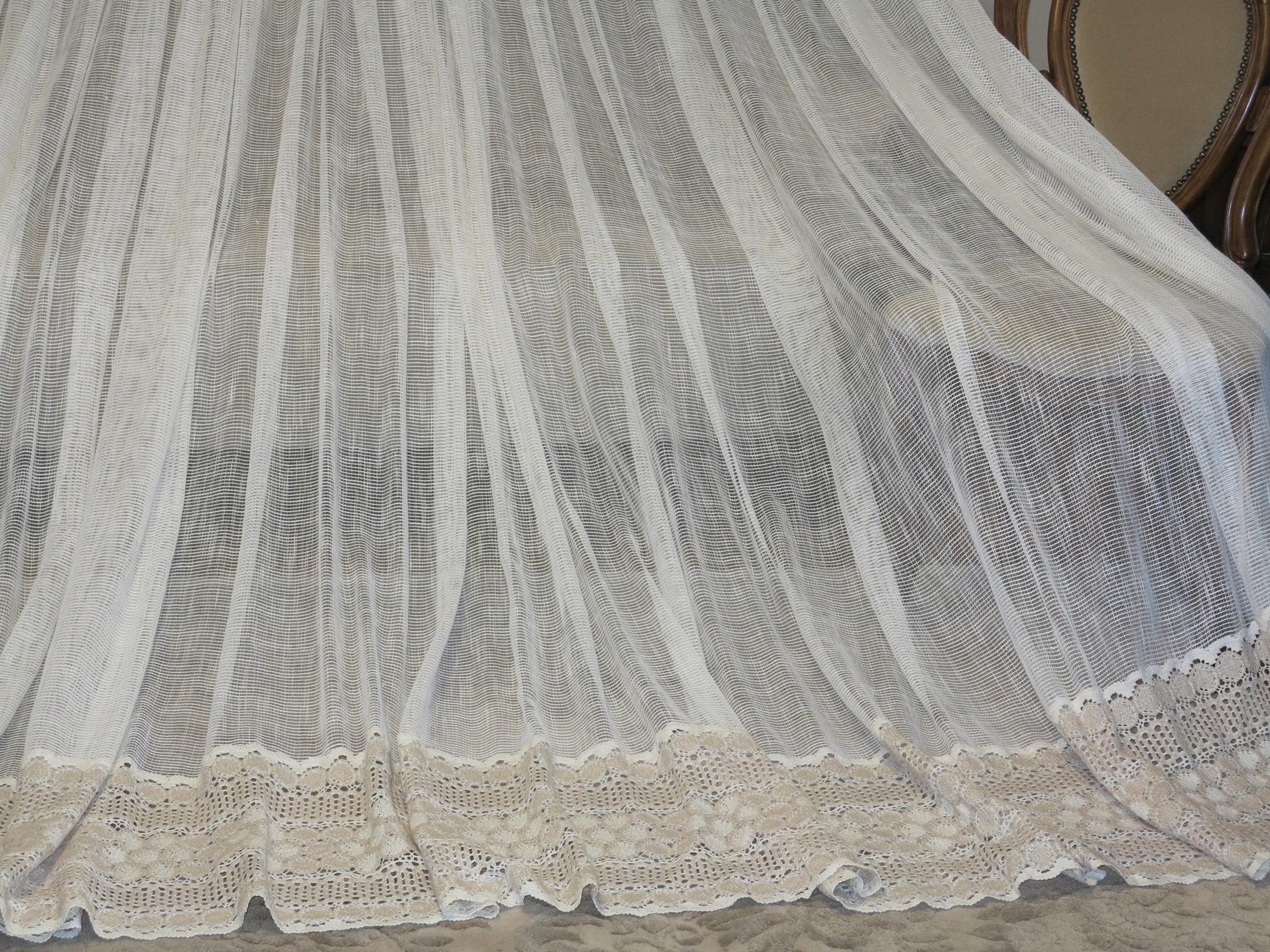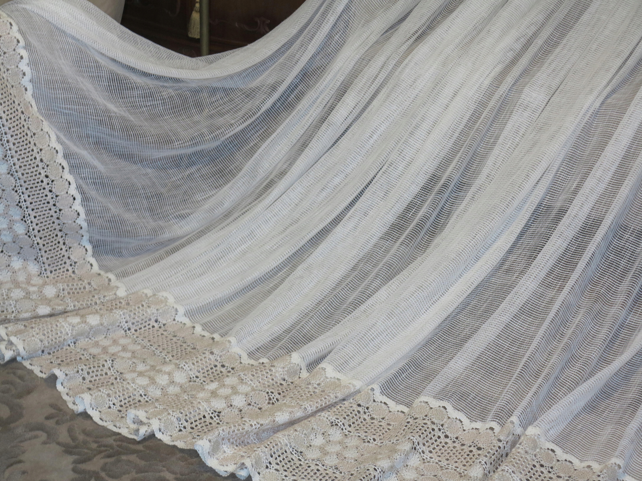 УНИКАЛЬНУЮ ОГРОМНУЮ ШТОРУ, ПОЛНОСТЬЮ ИЗ ВЫСОКОКАЧЕСТВЕННОГО НЕМЕЦКОГО ТЯЖЕЛОГО, струящегося и идеально ниспадающего СЕТОЧНОГО КРУЖЕВА ВНИЗУ С ТОЛСТЫМ И ШИРОКИМ ХЛОПКОВО-СИНТЕТИЧЕСКИМ КРУЖЕВОМ БЕЖЕВОГО ЦВЕТА. САМ ЗАНАВЕС КРЕМОВО-БЕЛЫЙ