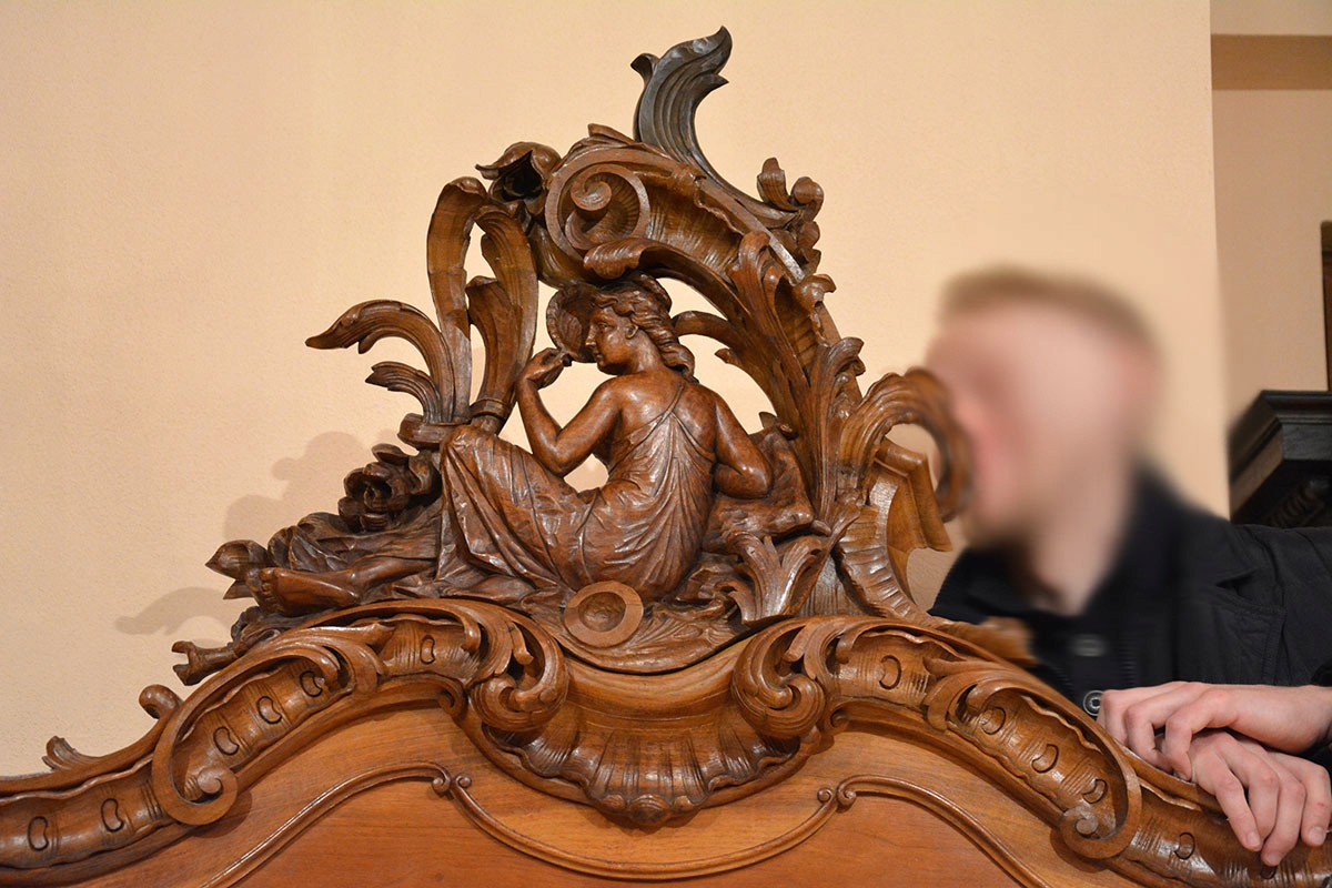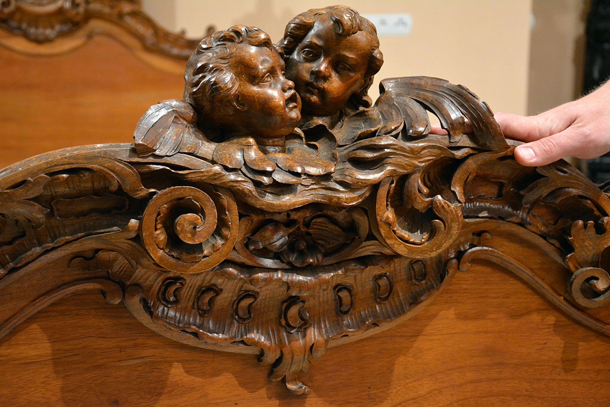 Нижний фронтон кровати относится к высшему. Увенчана скульптурой с изображением крылатых голов путти - резные украшения с амурами, взятыми из мифологических представлений, были характерны для украшения мебели, предназначенной для отдыха.