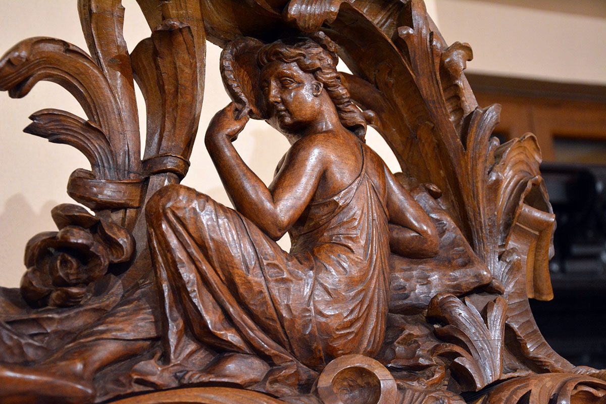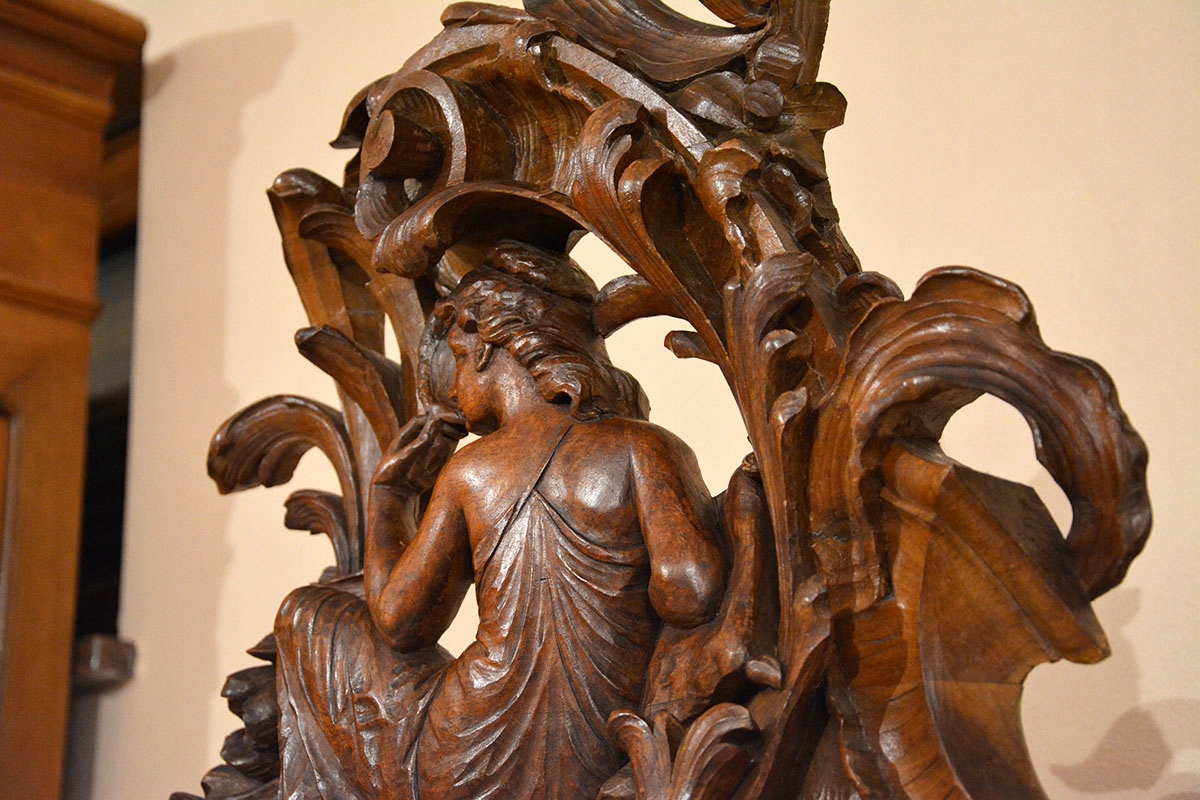 Верхний фронтон украшен многочисленными художественными растительными орнаментами и ракушками в стиле рокайль, характерными для стиля рококо. Фронтон увенчан скульптурой в полный рост женщины в тунике, смотрящей на себя в зеркало. Обратите внимание на точность скульптуры, окруженной ажурными деревянными рокайлями, листьями аканта и цветами.