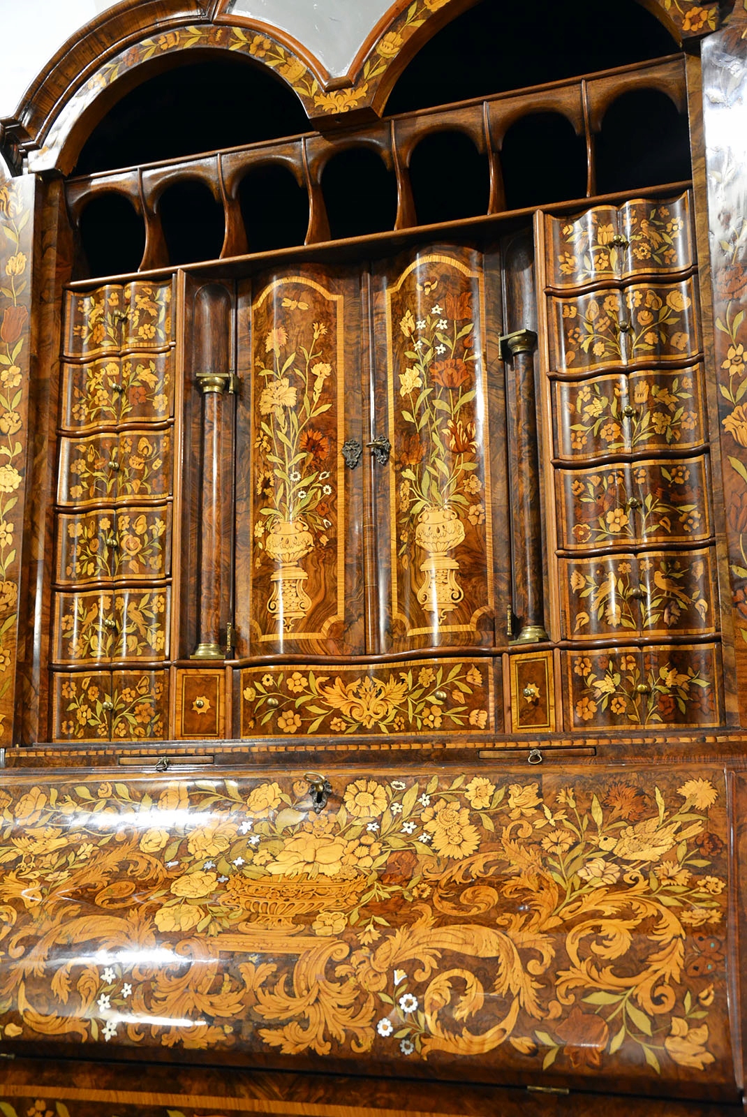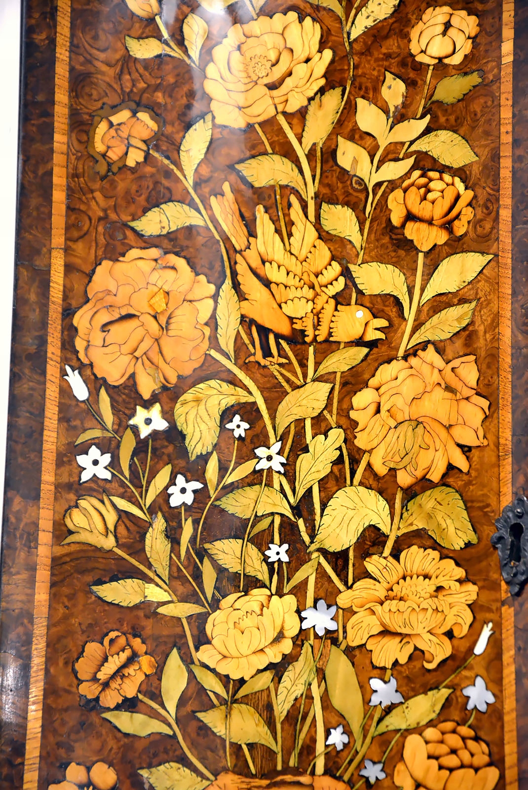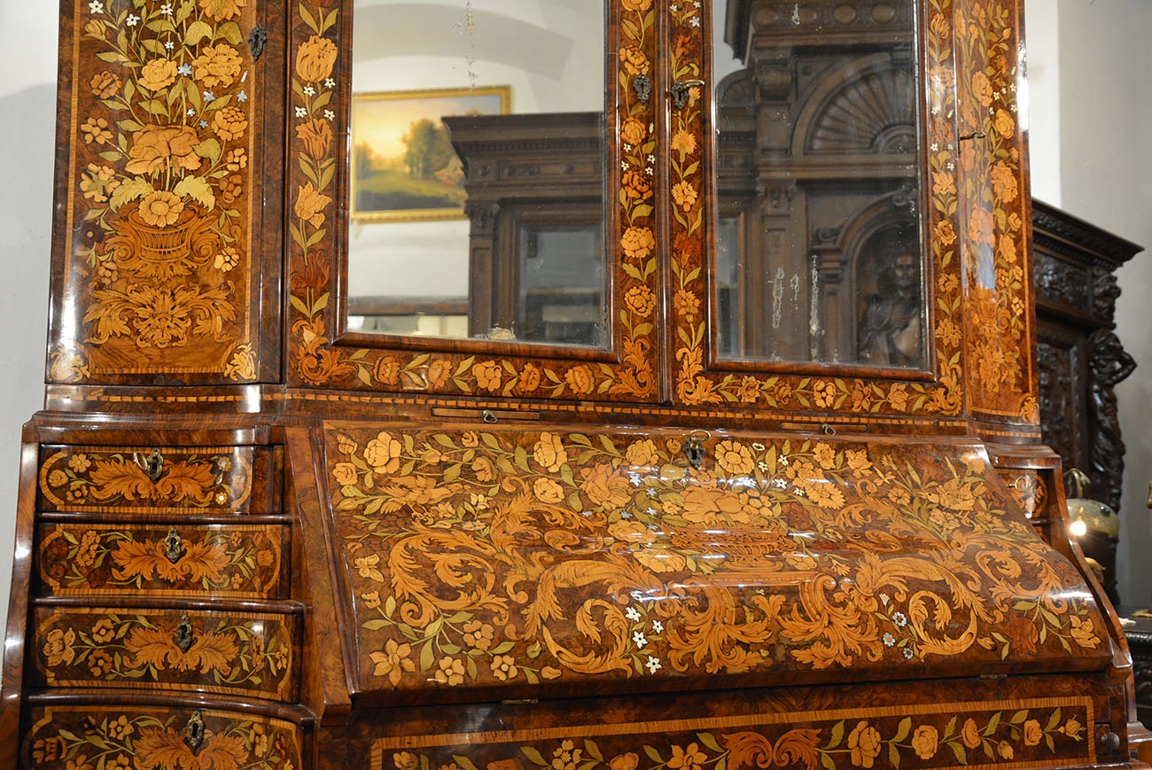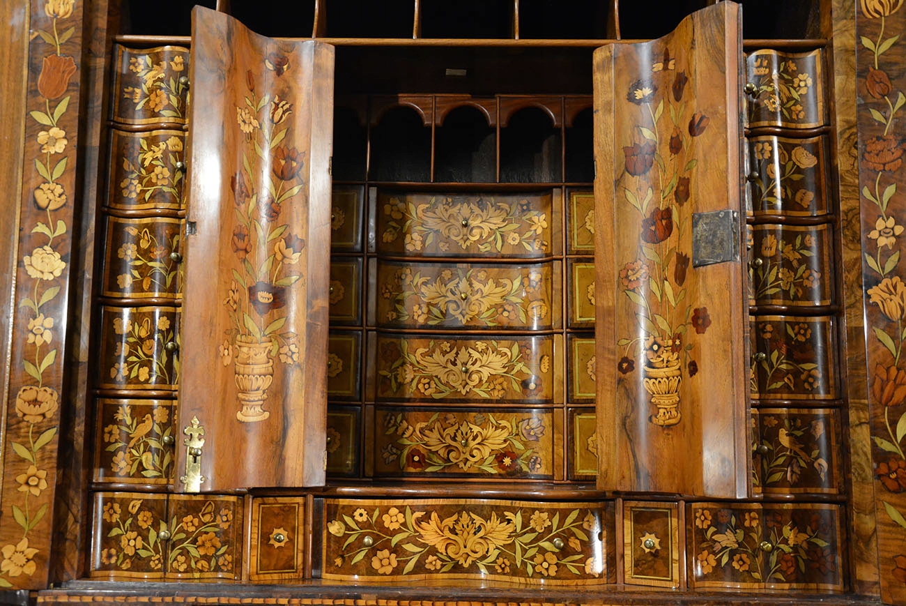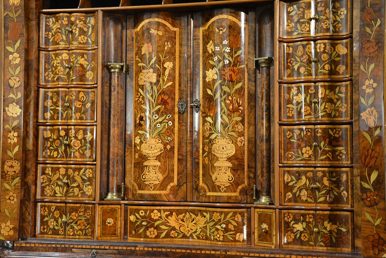 Вся поверхность мебели, даже боковины, и внутренняя часть инкрустированы разными породами дерева. Во многих местах он инкрустирован перламутром и слоновой костью. В нем преобладают цветочные мотивы с множеством видов цветов, а также насекомыми, дельфинами и горгульями. Последние - морские существа - могли появиться, вероятно, потому, что предмет мебели мог быть изготовлен на заказ для судовладельца или богатого голландского купца. Обратите внимание на качество и точность маркетри, где во многих местах видно, что древесина затенена. Это доказывает выдающееся мастерство создателя мебели.
