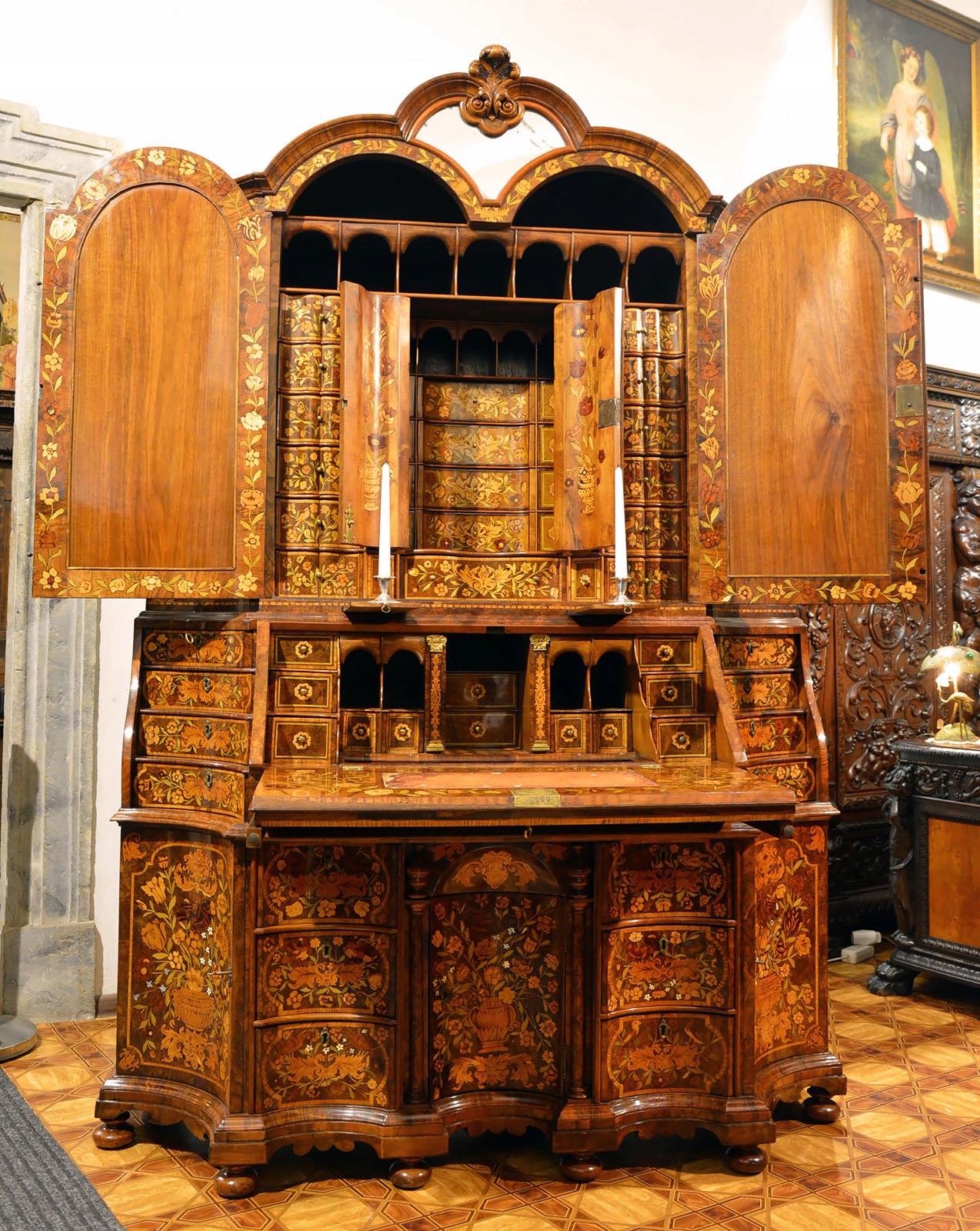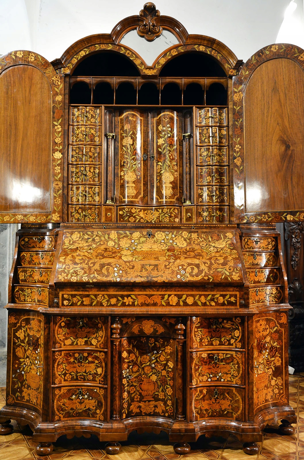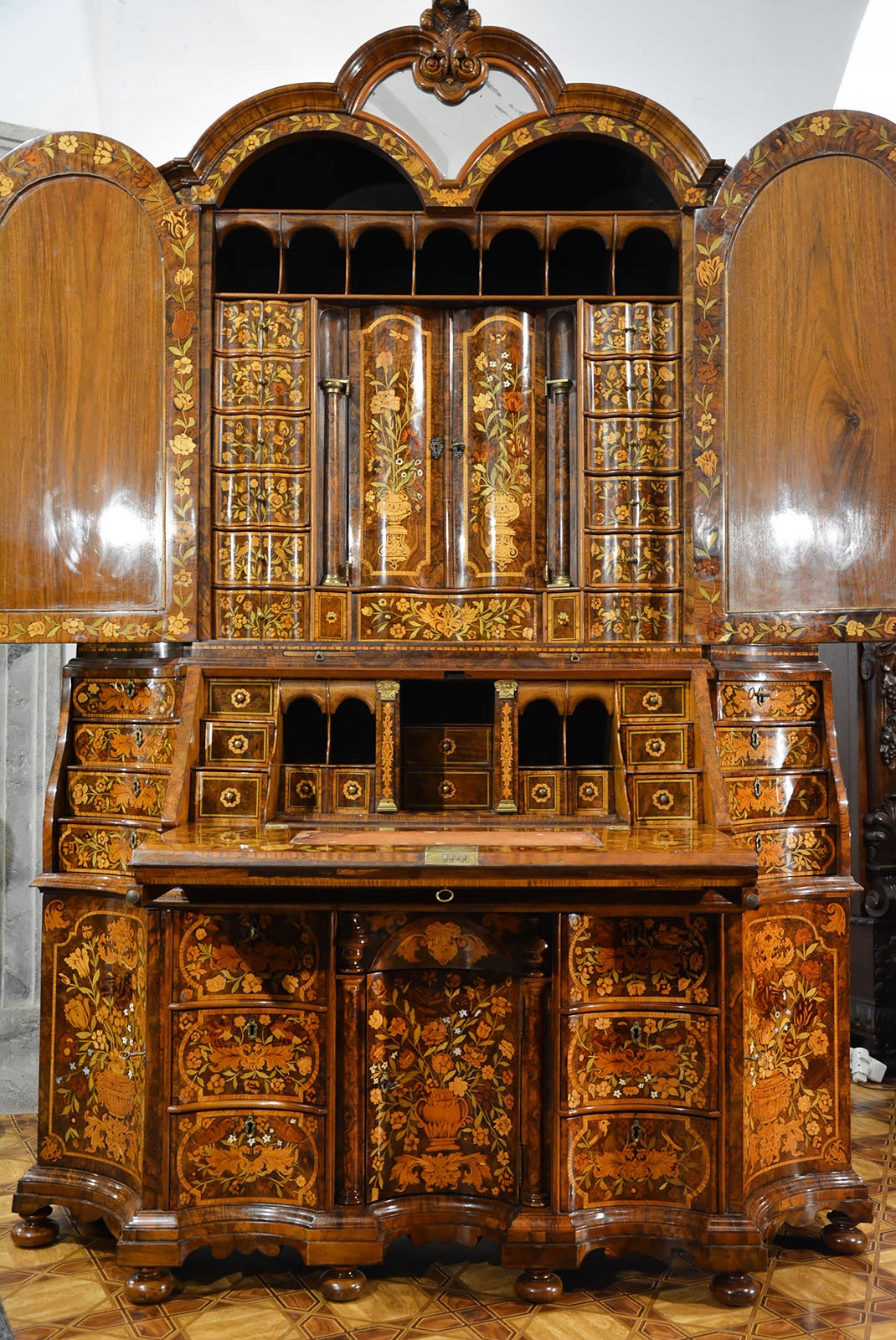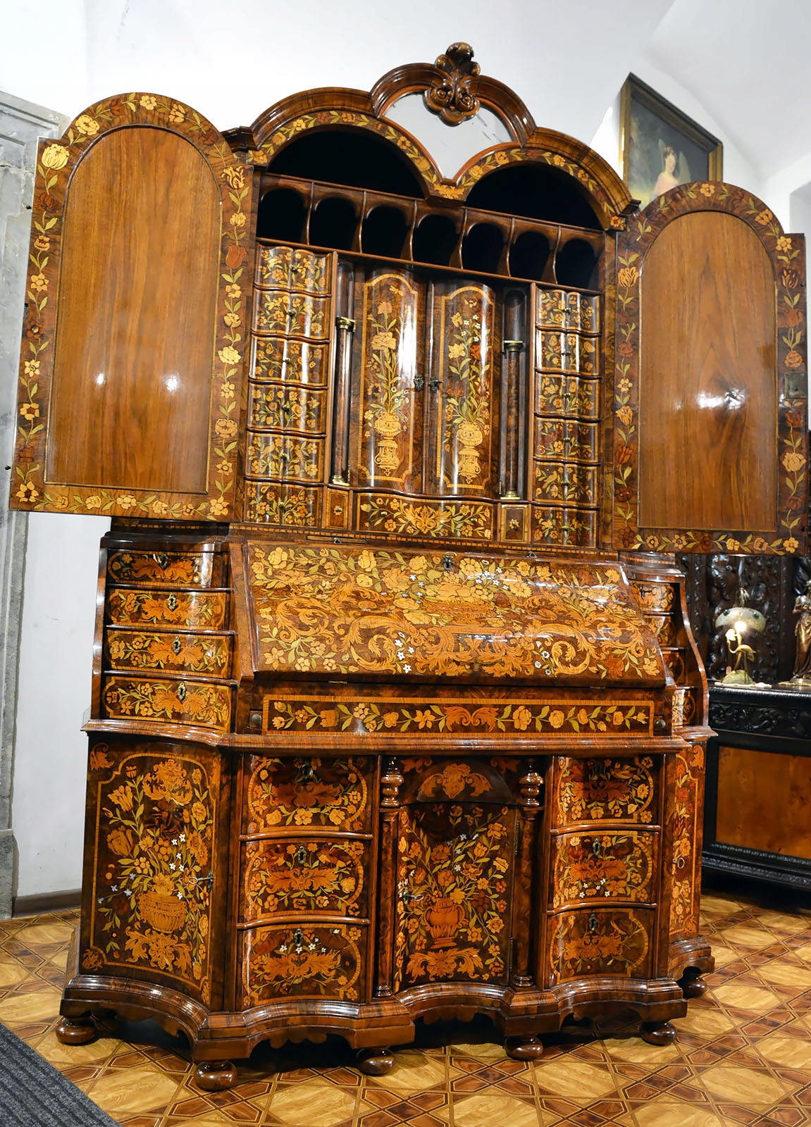Средняя дверца гарнитура скрывает двенадцать маленьких ящиков уникальной формы раскрытой книги, а еще одна волнистая дверца, за которой расположены ящики и отделения для рукописей . Фасады дверей и лицевые панели ящиков с цветочной маркетри.
