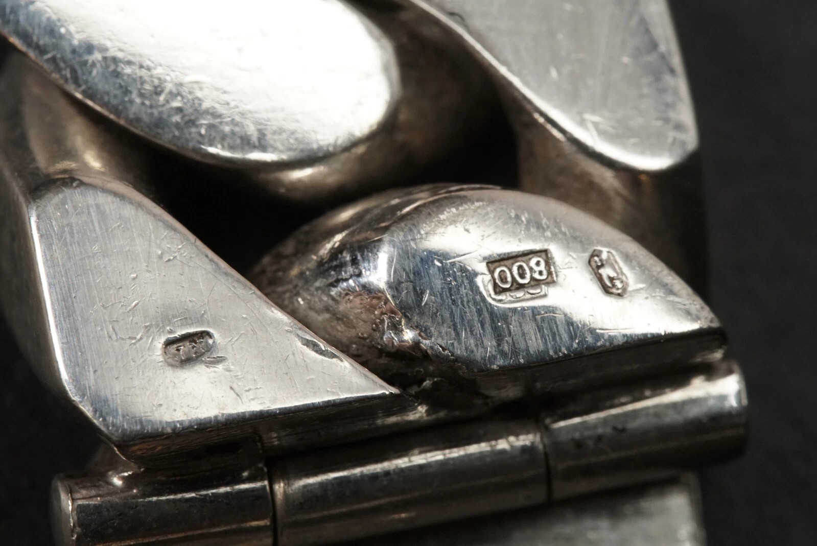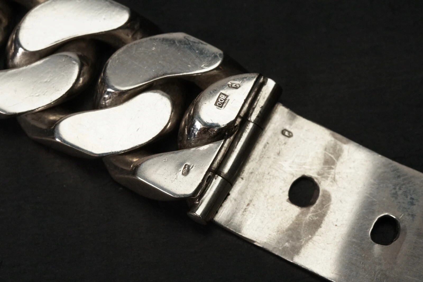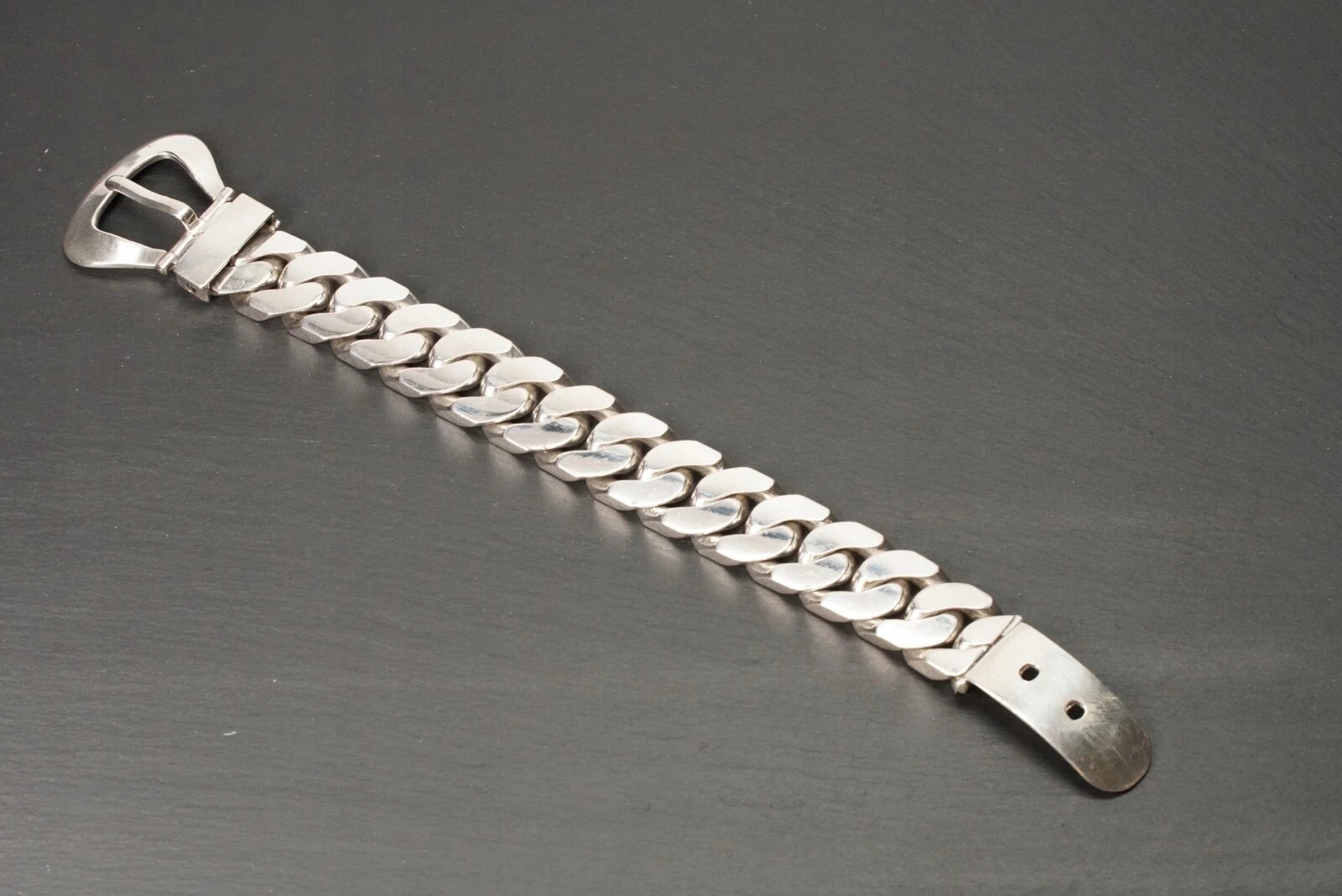 Уникальный браслет, изготовленный в форме ремня, сделанного в попытках серебра 800. Размеры браслета - общая длина 25 см, ширина 2 см. Прета с размерами 3,9 х 2,5 см. Вес браслета - 178 500 грамм. Регулируемая длина. Подписанная попытка серебра 800 и дополнительные подписи, видимые на фотографиях. Аукцион относится к самому браслету. Условие, как на фотографиях.