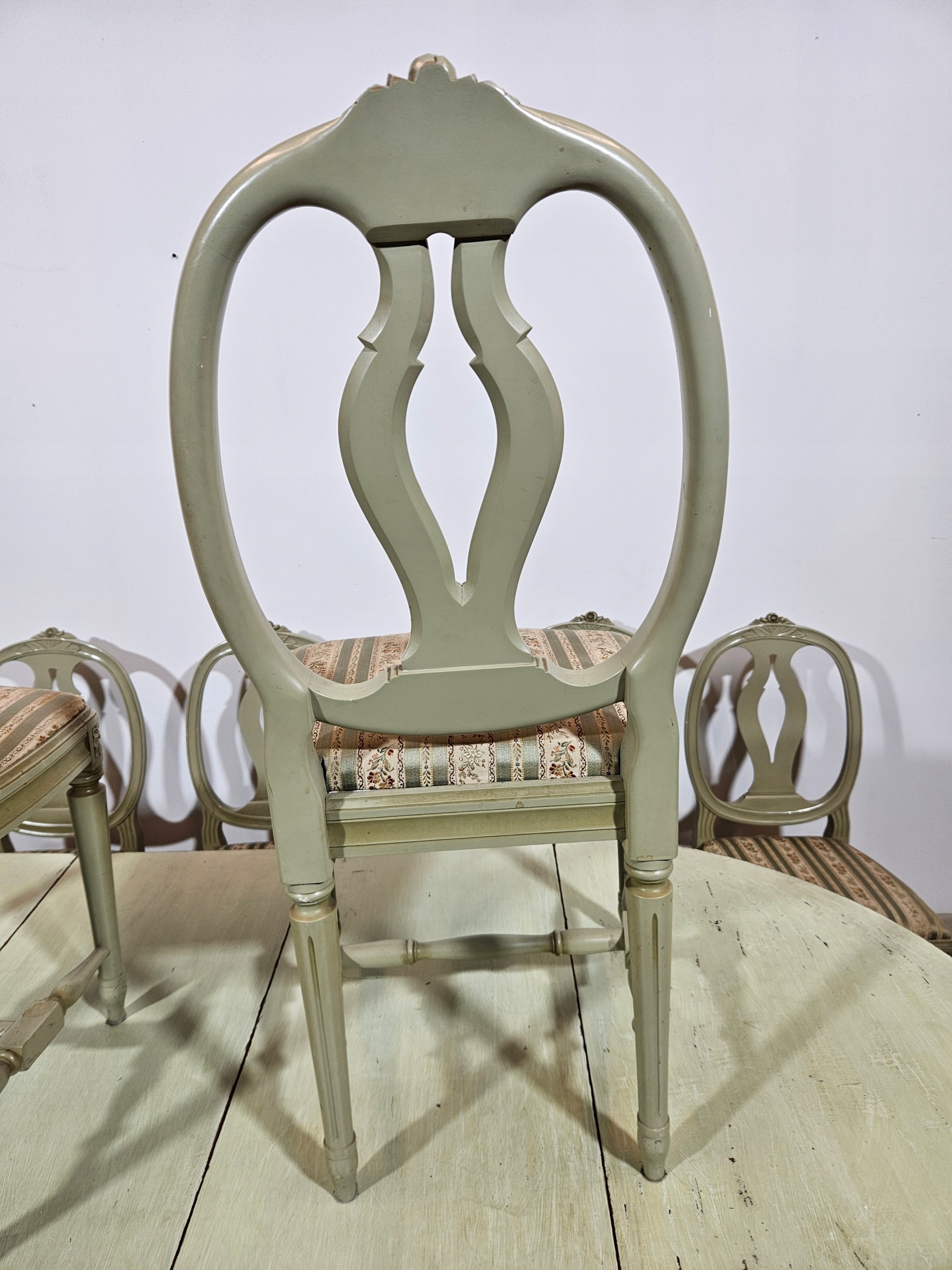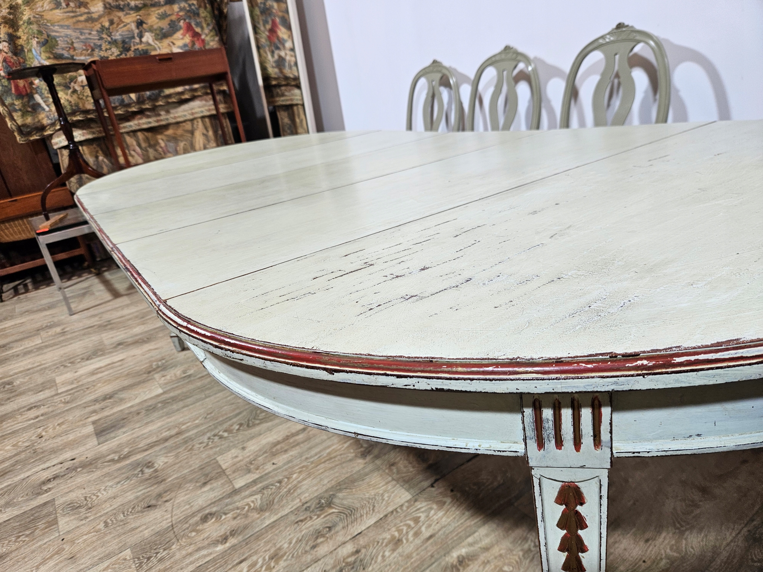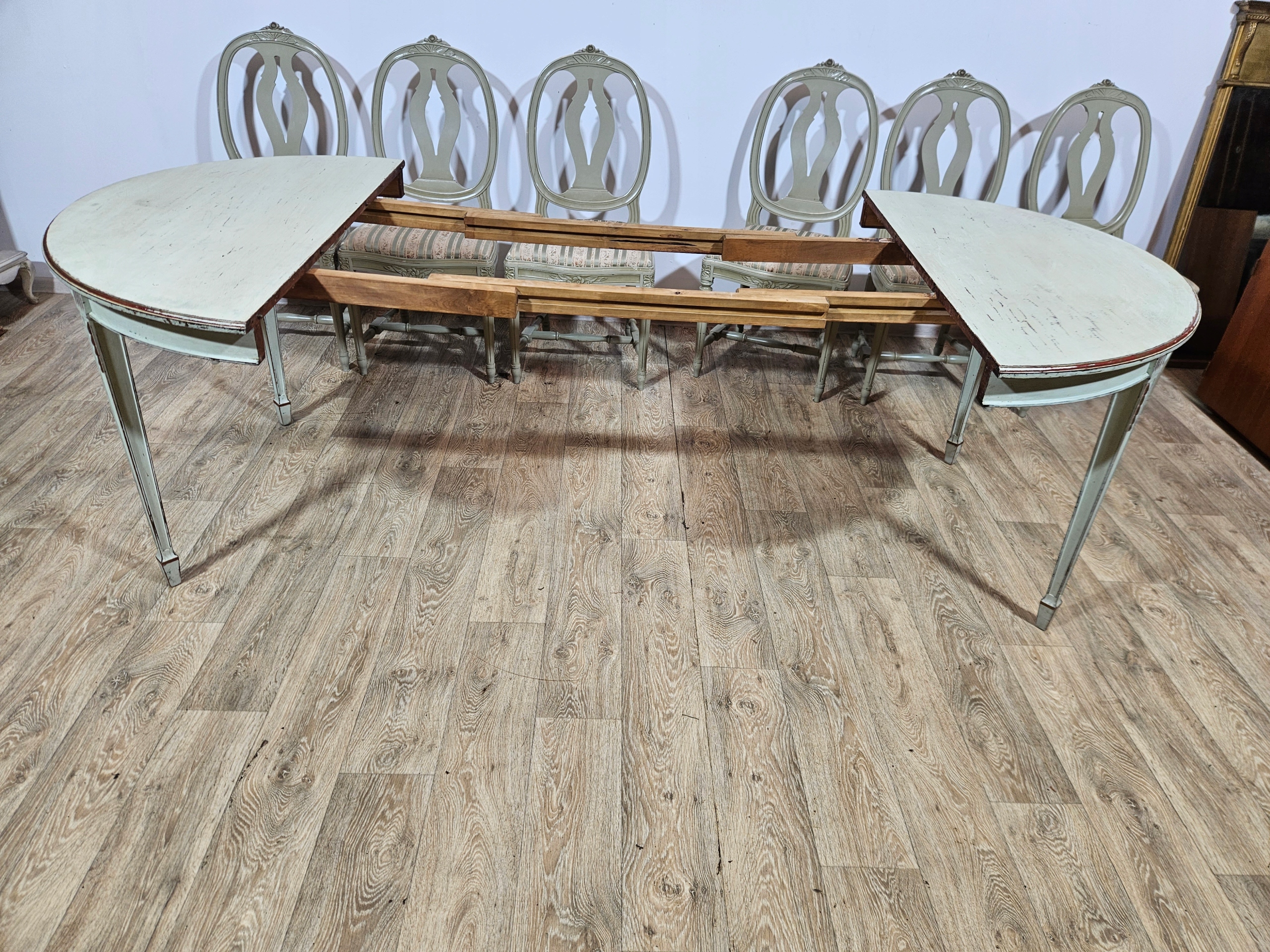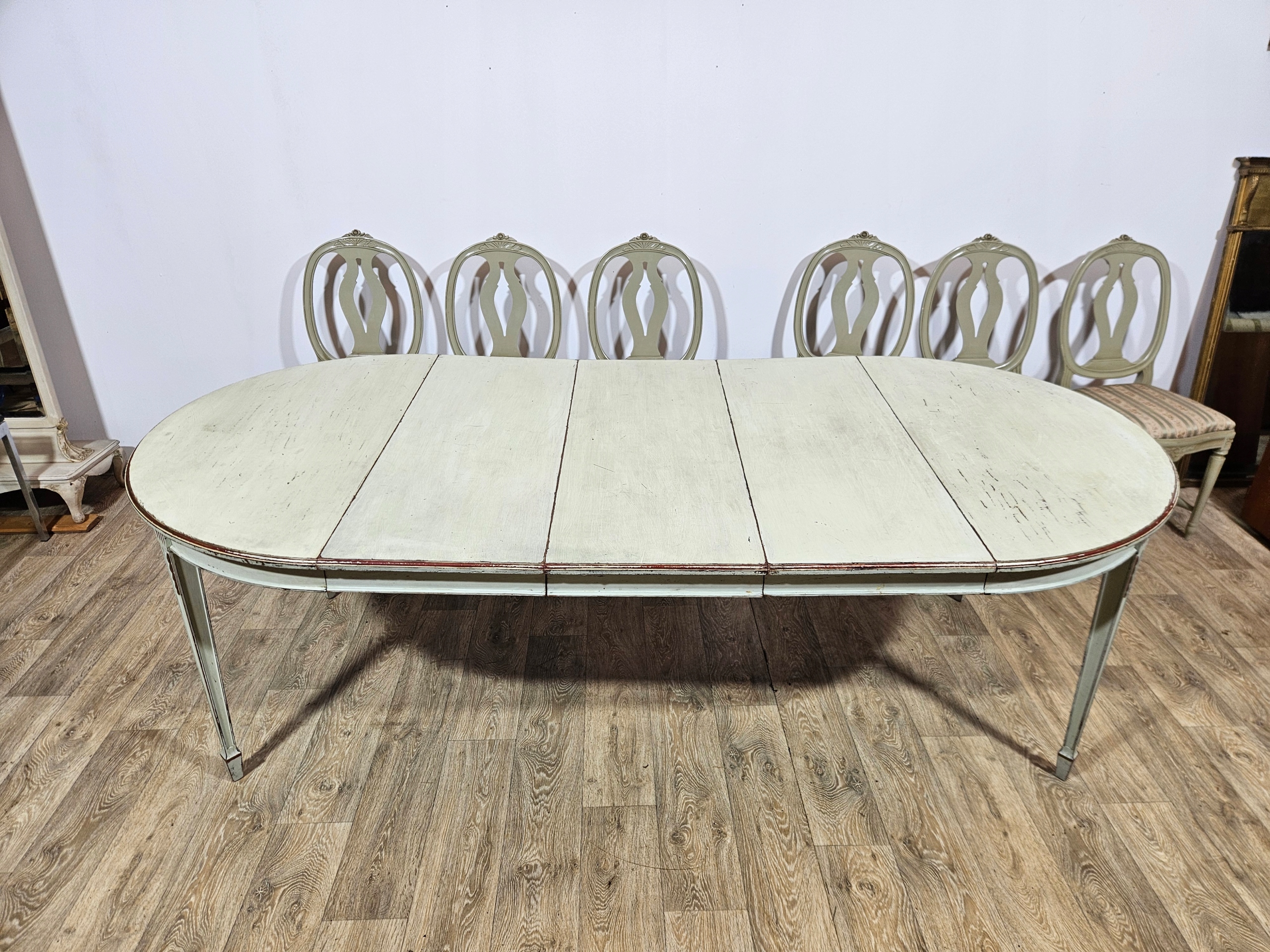 Восхитительный и полный обеденный набор, состоящий из раздвижного стола и шести стульев, квинтэссенция элегантности в густавианском стиле. Идеально подходит для ценителей, ценящих светлые, просторные интерьеры в скандинавском стиле или стиле шебби-шик.