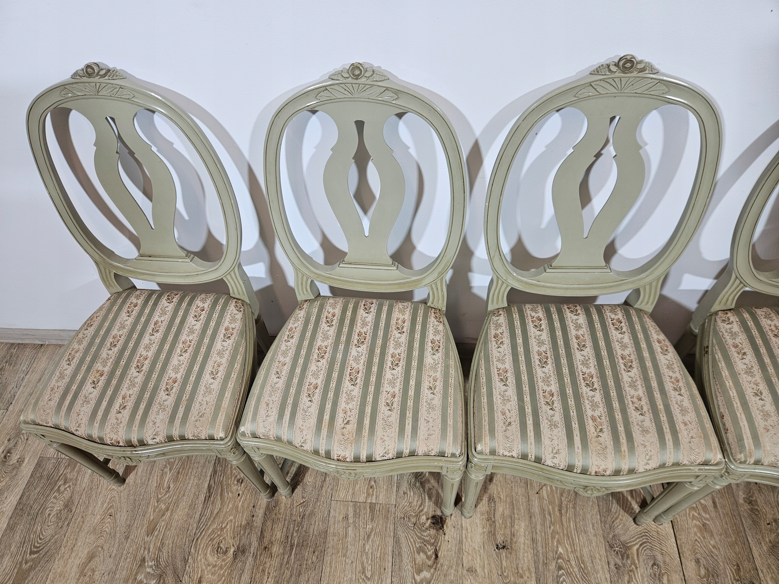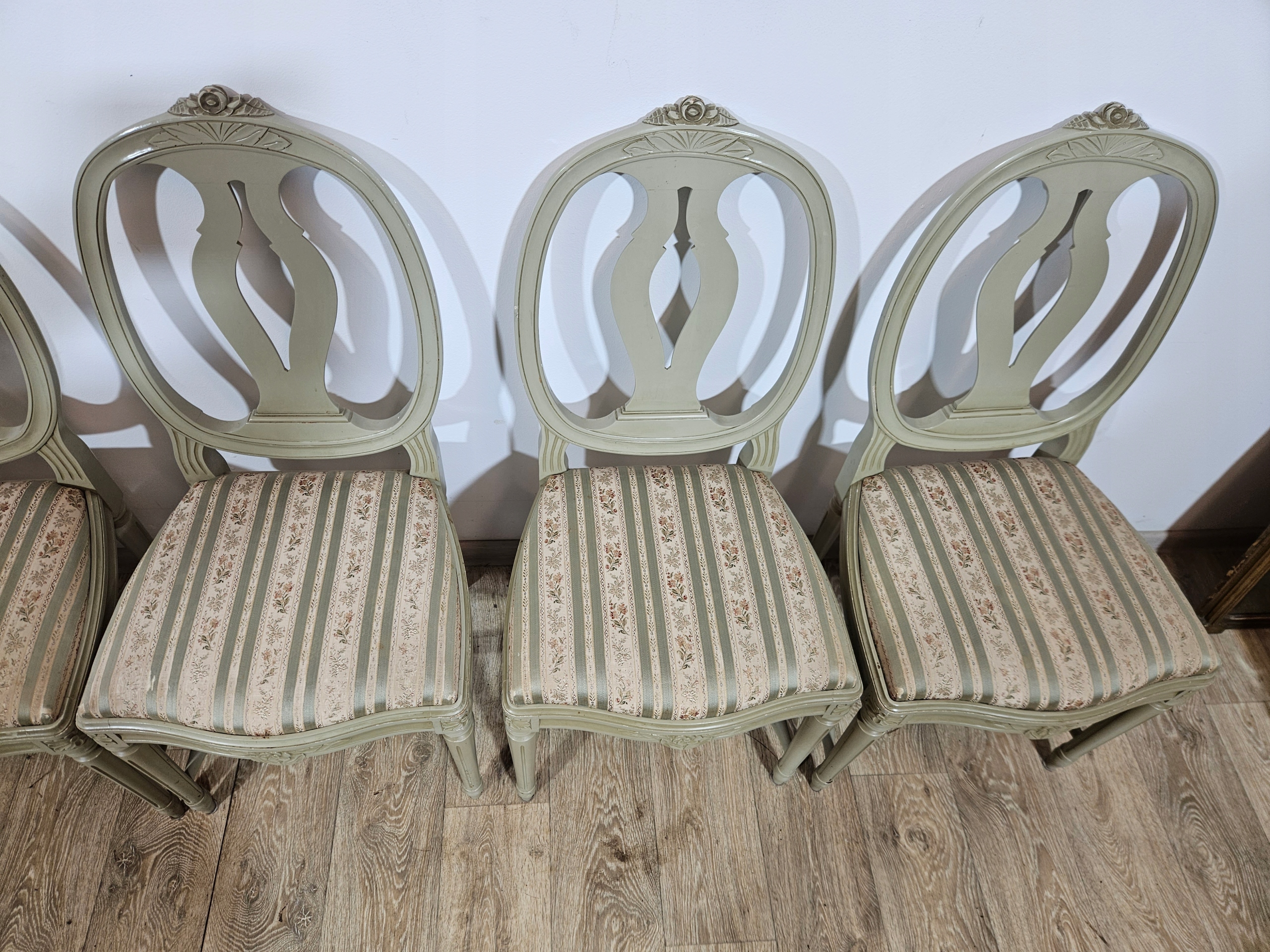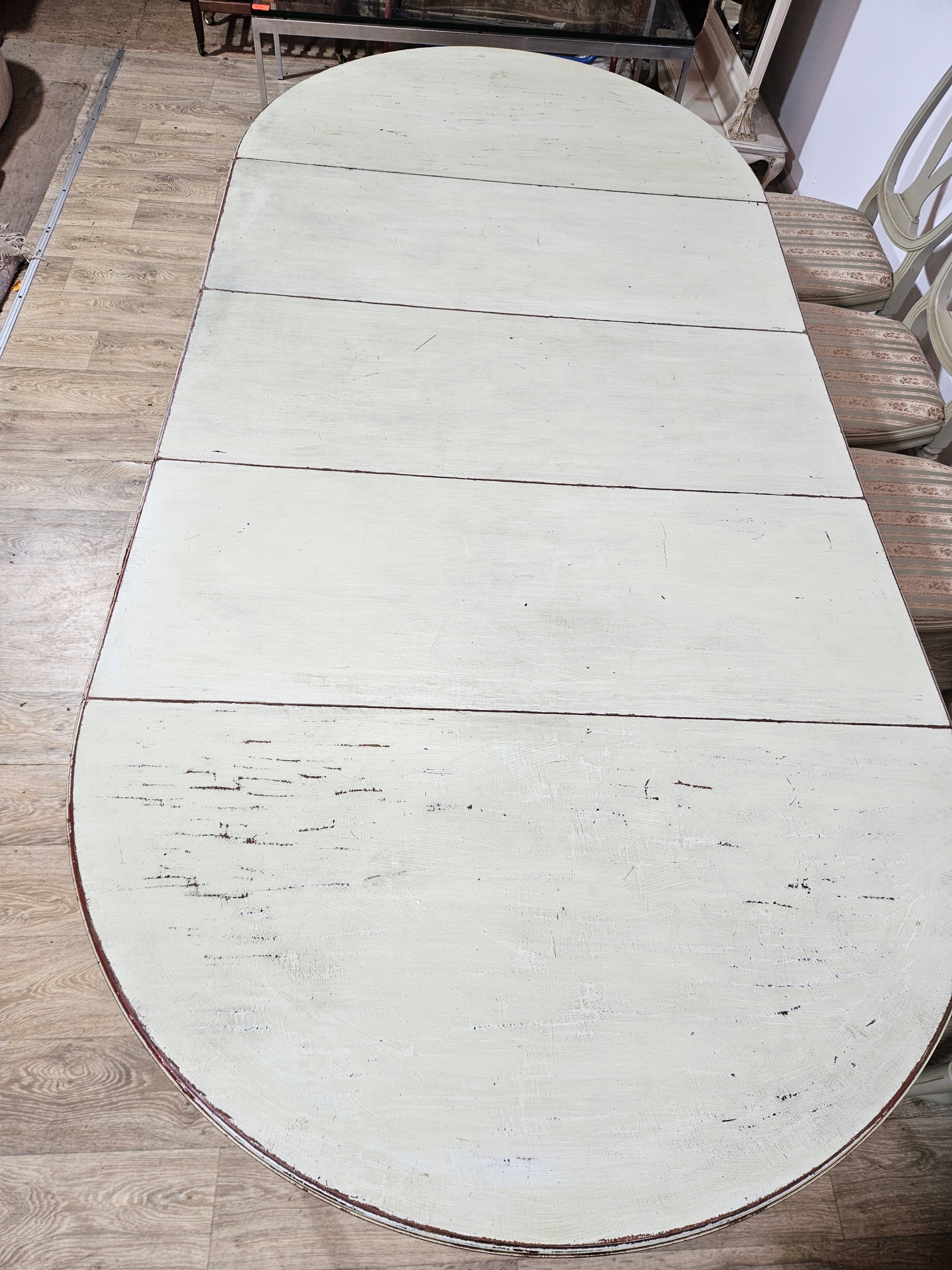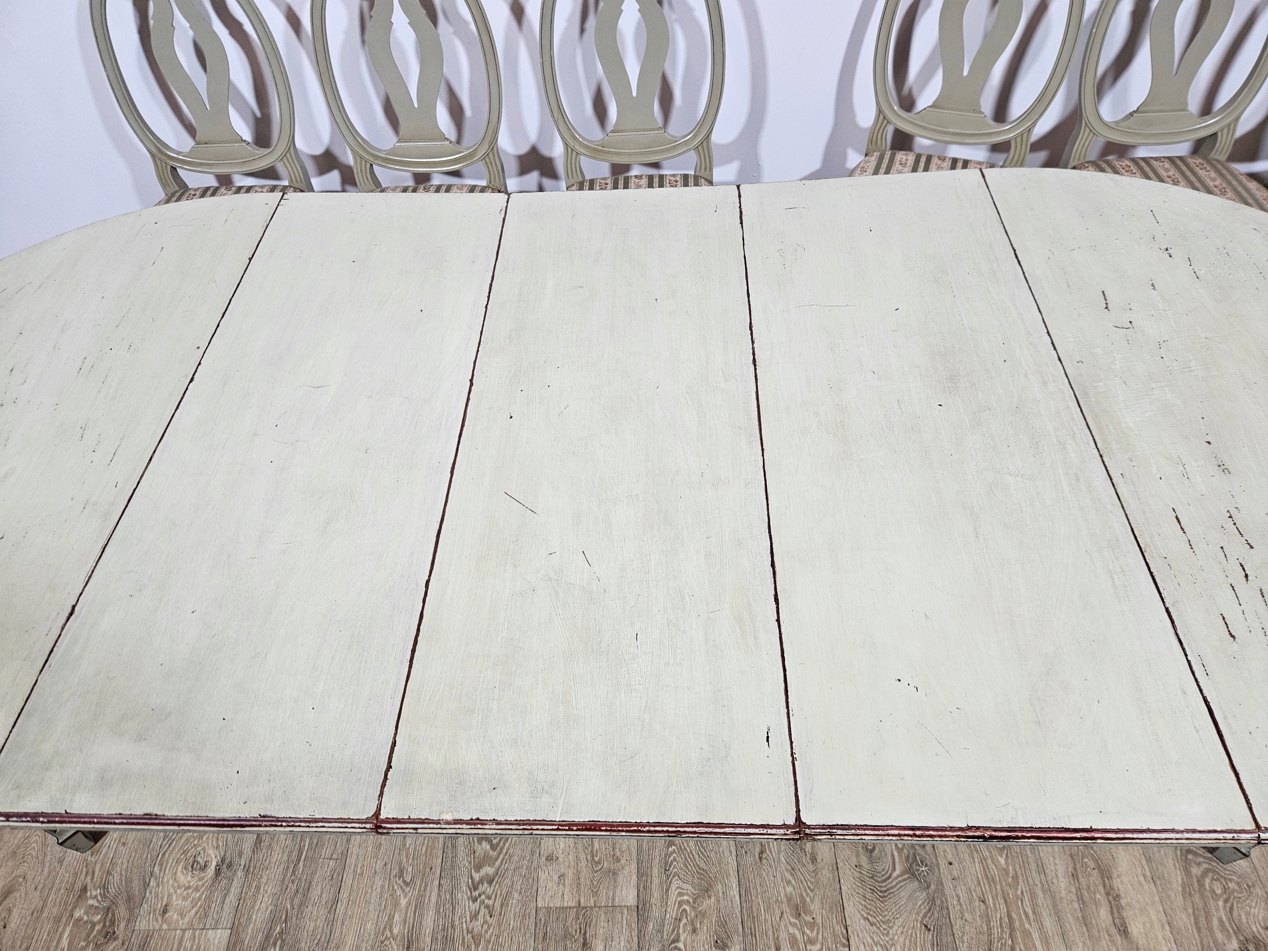 Восхитительный и полный обеденный набор, состоящий из раздвижного стола и шести стульев, квинтэссенция элегантности в густавианском стиле. Идеально подходит для ценителей, ценящих светлые, просторные интерьеры в скандинавском стиле или стиле шебби-шик.