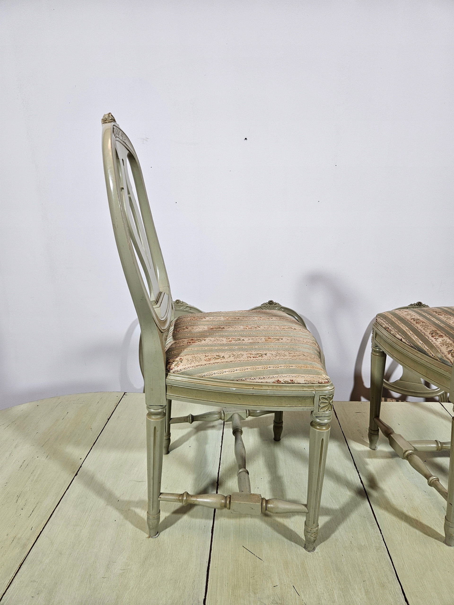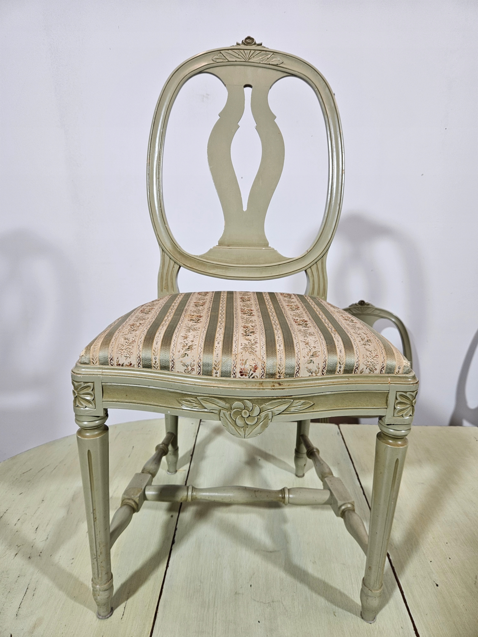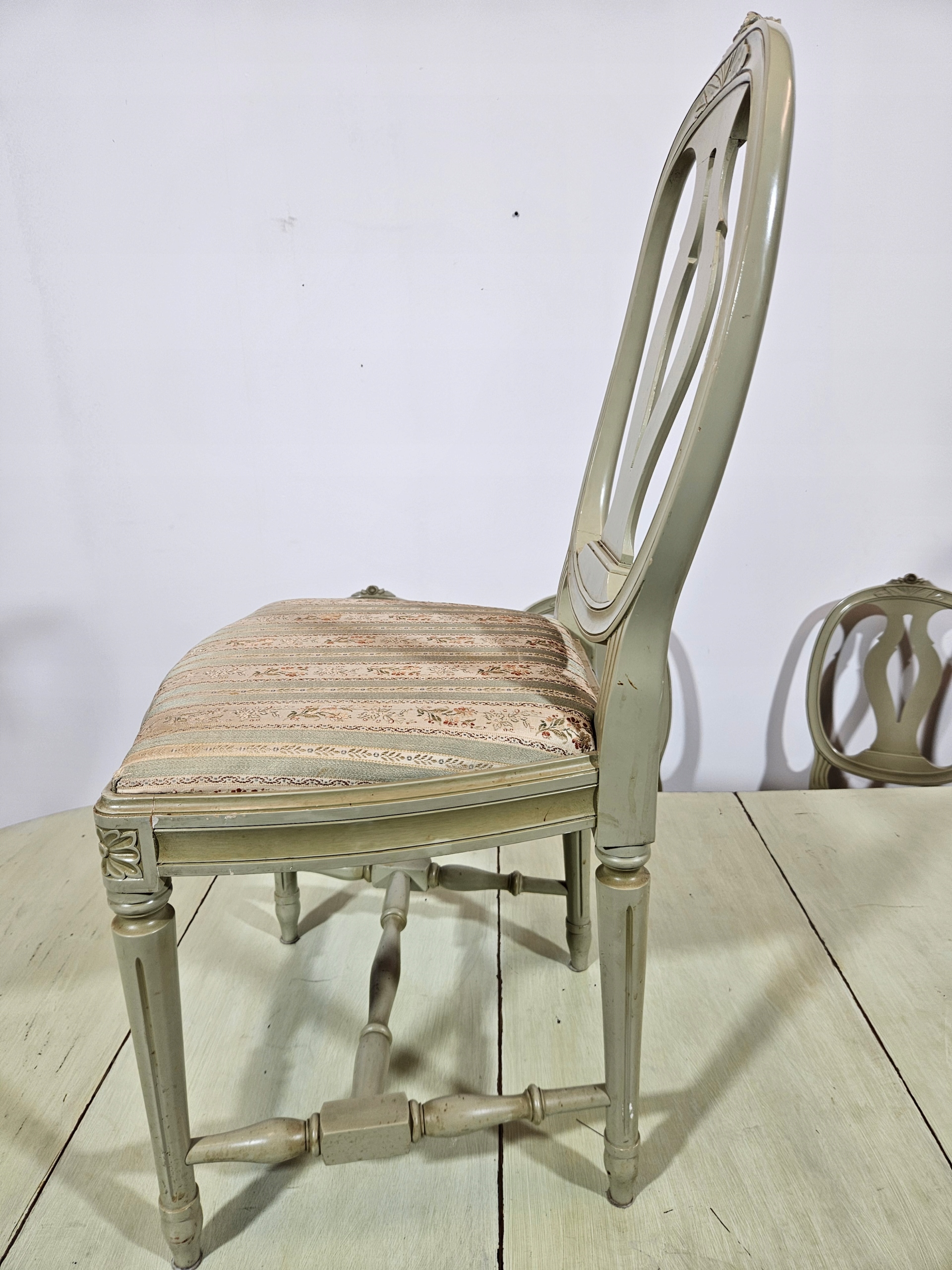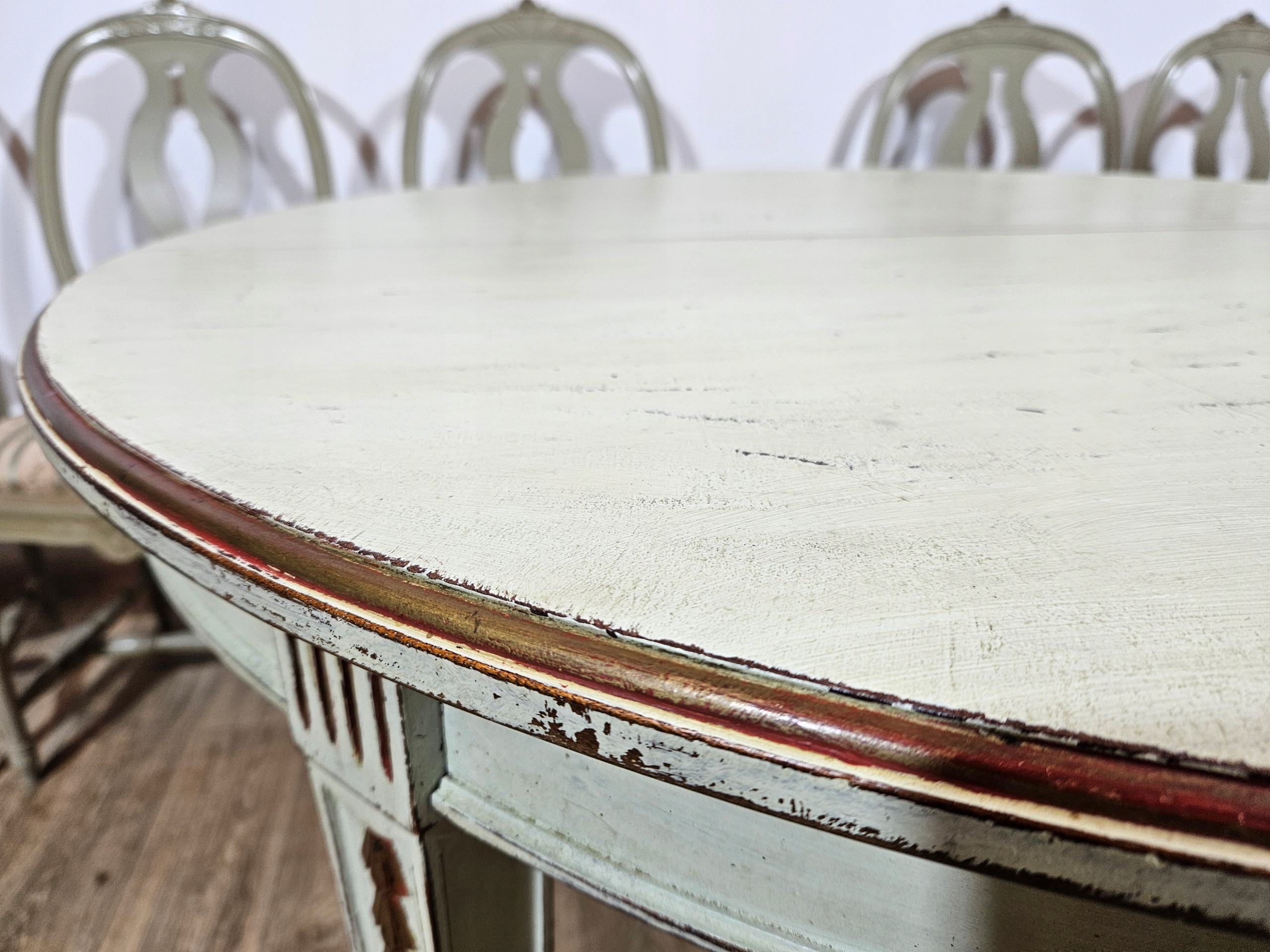 Восхитительный и полный обеденный набор, состоящий из раздвижного стола и шести стульев, квинтэссенция элегантности в густавианском стиле. Идеально подходит для ценителей, ценящих светлые, просторные интерьеры в скандинавском стиле или стиле шебби-шик.