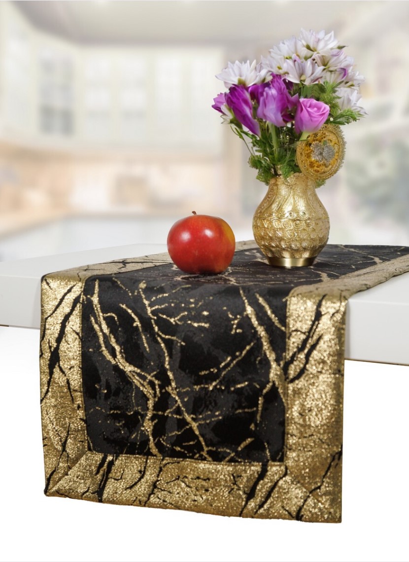 Роскошная (премиум -класс), красивая скатерть/черная протектора с блестящими, золотистыми вставками, как мрамор. Металлизованный узор подчеркивает уникальный характер стола, чрезвычайно декоративный и в то же время очень стильный.