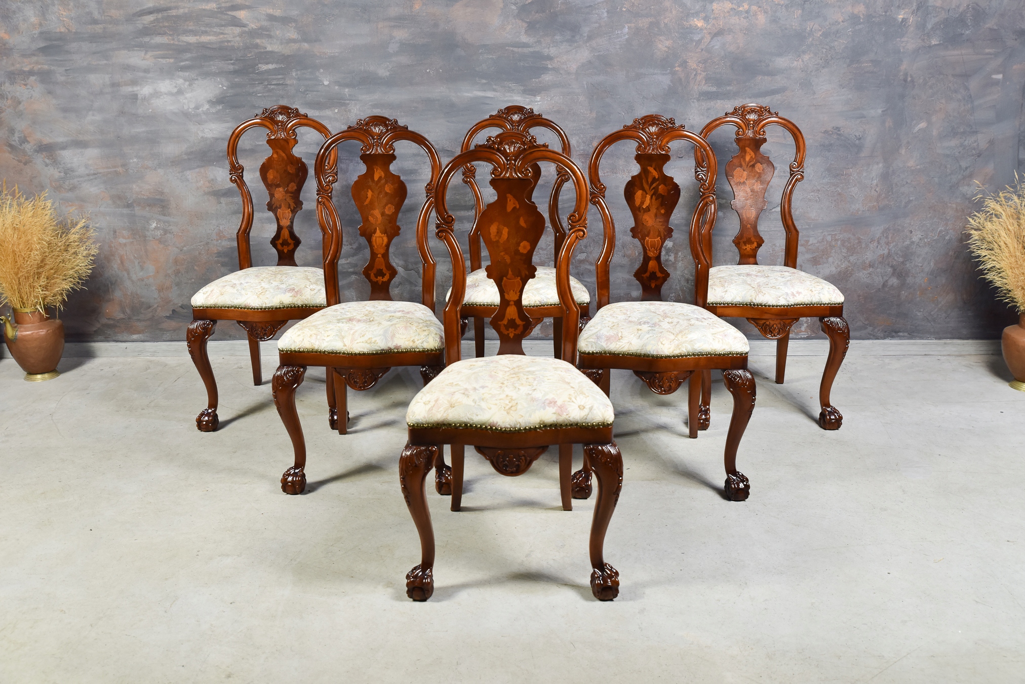 Комплект полностью изготовлен из массива ореха. И стулья, и стол имеют очень интересную форму. Дополнительным преимуществом является красиво выполненная маркетри.