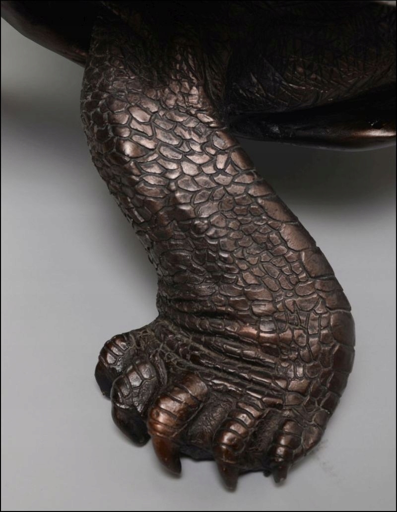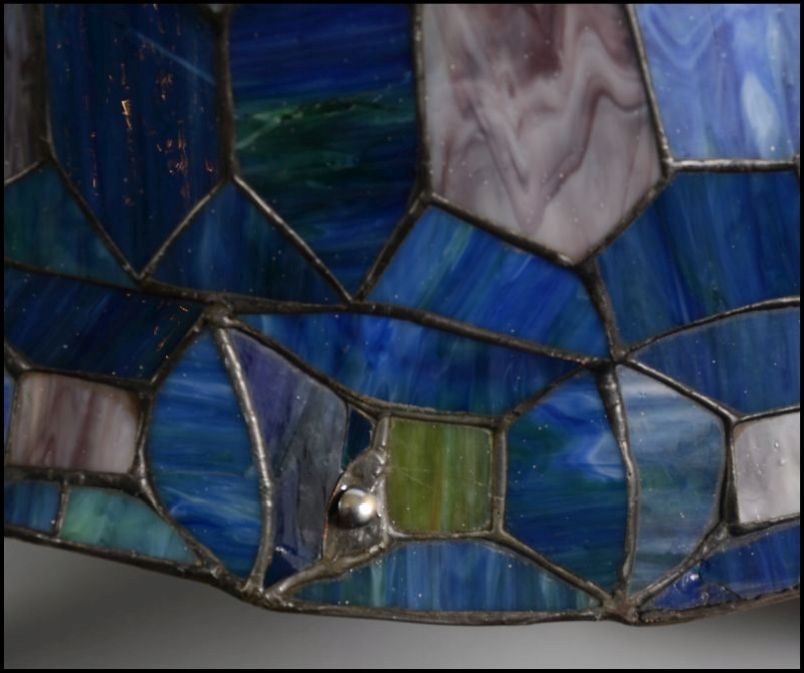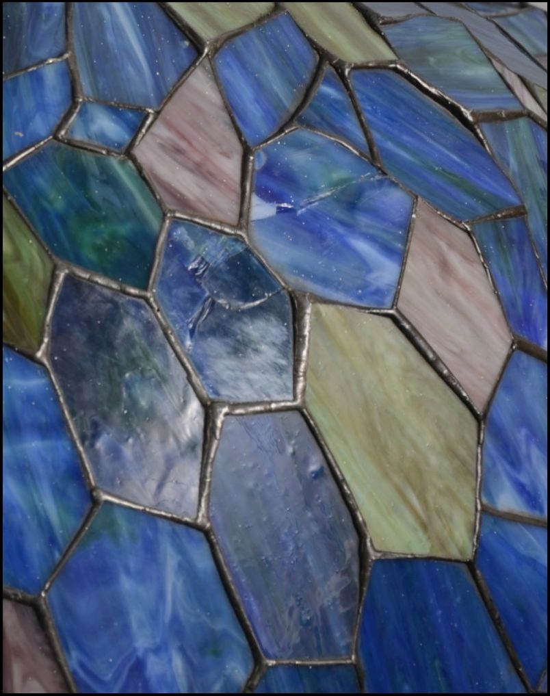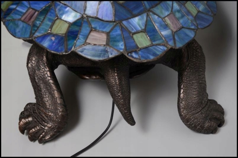 Основа светильника - панцирь - изготовлена из высококачественной смолы - это прочный и точный слепок, на 100% отражающий реальный силуэт этой рептилии. Рамка окрашена в темно-графитовый цвет с золотистыми отблесками. Обращает на себя внимание огромный панцирь черепахи, состоящий из множества стеклянных элементов, склеенных друг с другом, как витраж. Стеклянные панели бывают синего и зеленого цветов. В результате использования данной лампы было повреждено несколько небольших стекол (это видно на прилагаемых фото - это мелкие царапины), а некоторые из них были заменены прозрачными стеклами. Стеклянная оболочка красиво смотрится при включенном свете, создавая неземной эффект радуги. Эта вещь необычного размера преобразит интерьер и станет настоящей радостью для многих людей. Наша гигантская черепаха может найти свое место в оранжерее, на террасе и, прежде всего, в большом зале. Оригинальность и экстравагантность – вот что отличает наш торшер.