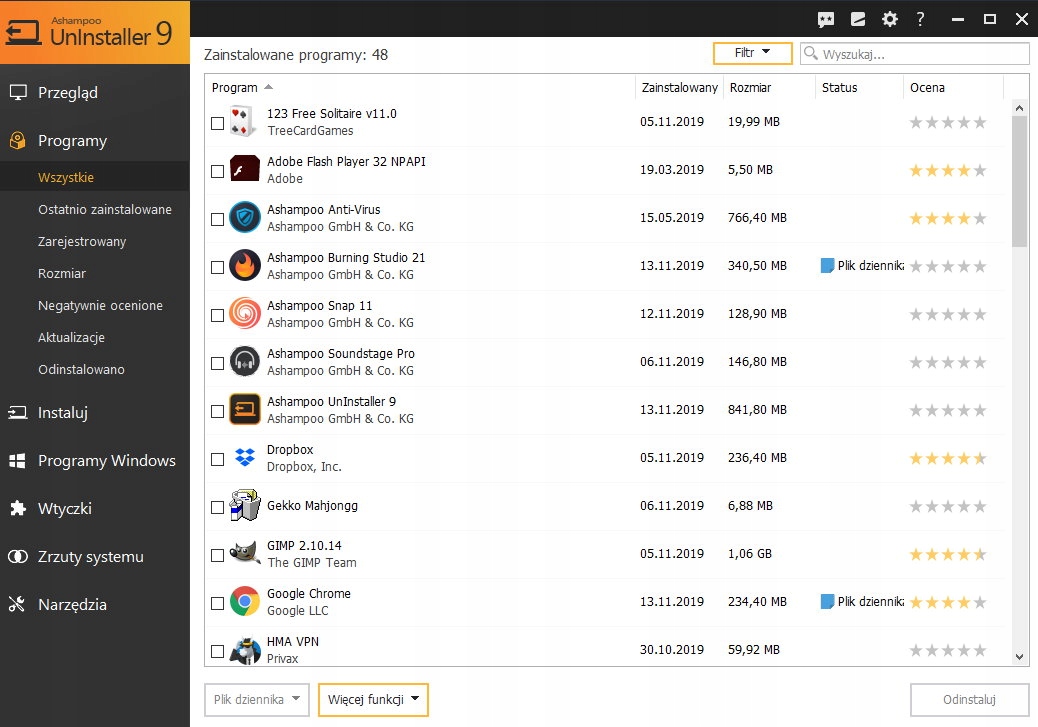 С Ashampoo® UnInstaller 9 даже новички могут добиться отличных результатов в кратчайшие сроки. Переработанный пользовательский интерфейс позволяет получить доступ ко всем основным функциям одним щелчком мыши. Даже сложные операции выполняются способом, не требующим пояснений. Избавьтесь от любой программы, не оставляя остатков, автоматически отслеживайте и контролируйте установку, наблюдайте, что происходит за кулисами установки, и попрощайтесь с нежелательным программным обеспечением. Купите деинсталлятор, который просто работает – как для новичков, так и для профессионалов!