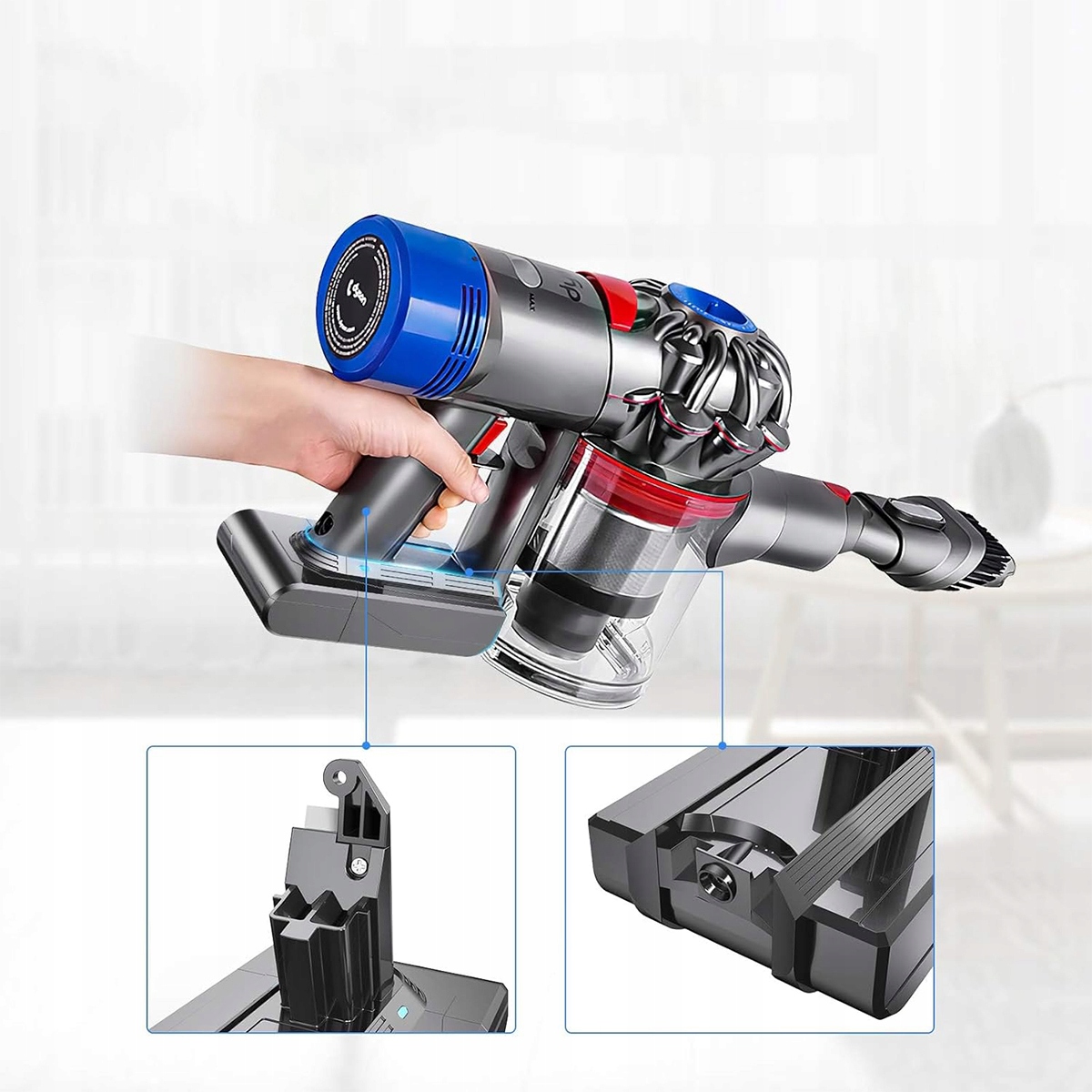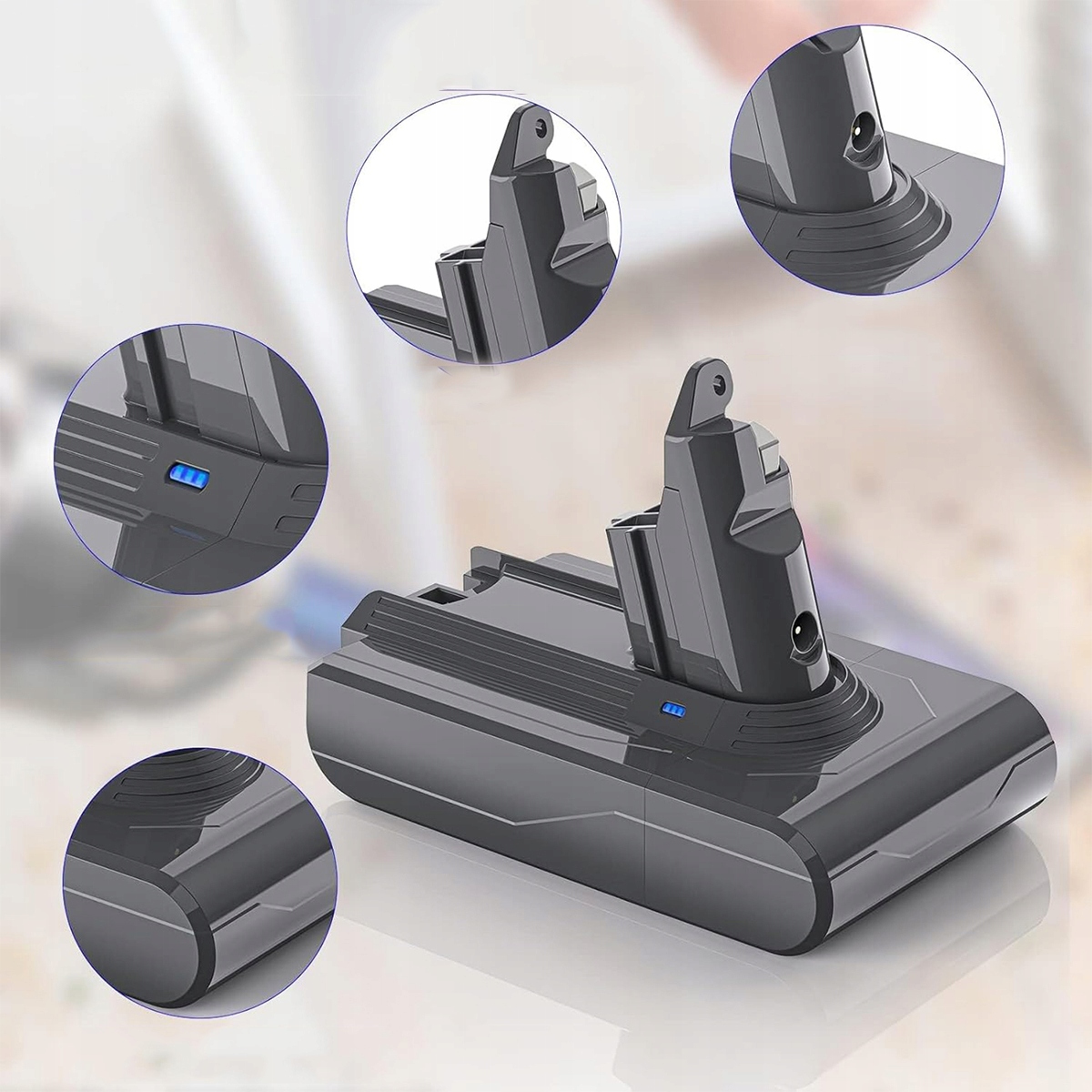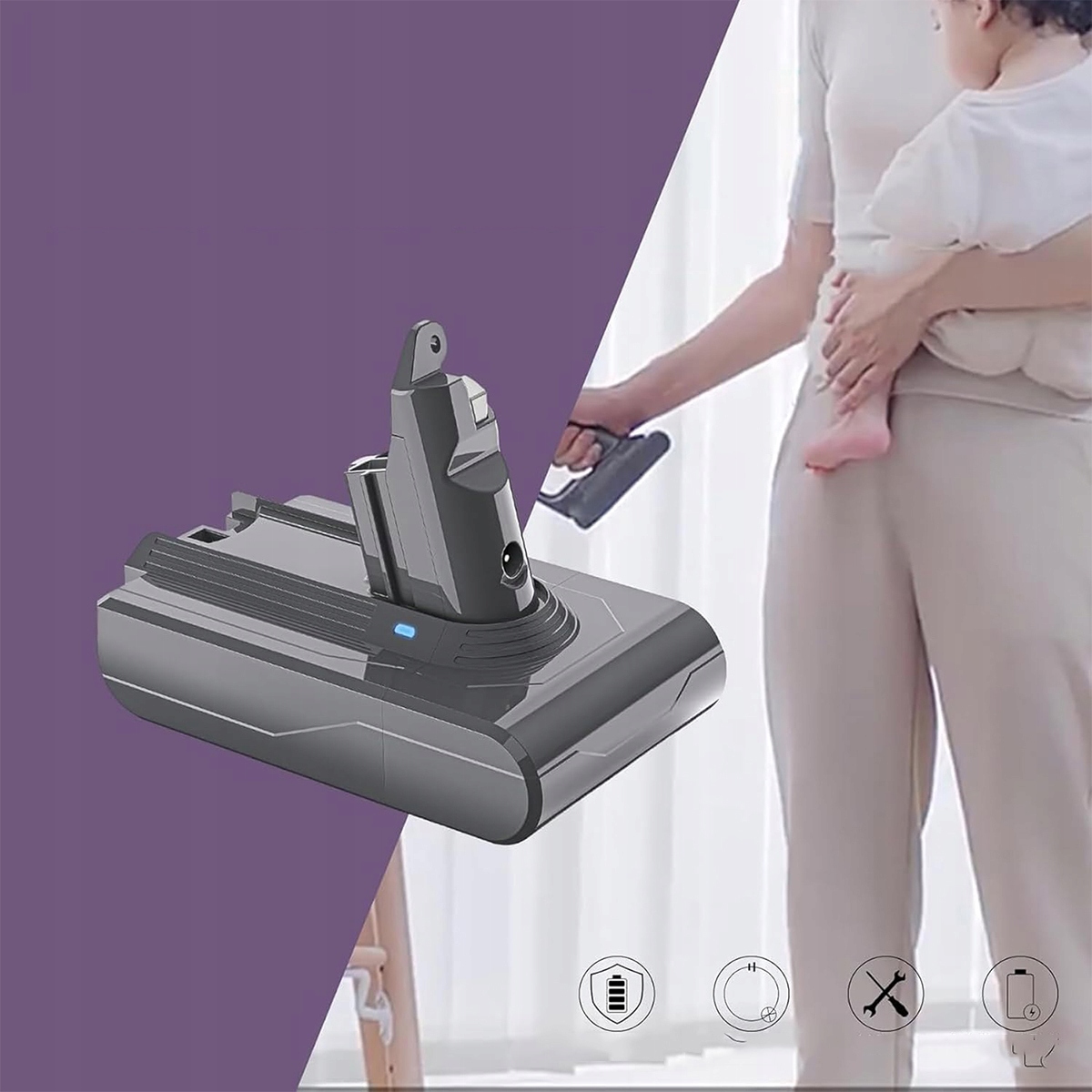- Модернизированный аккумулятор Dyson V6 емкостью 6,0 Ач для беспроводных пылесосов, который работает дольше, чем оригинальный аккумулятор.