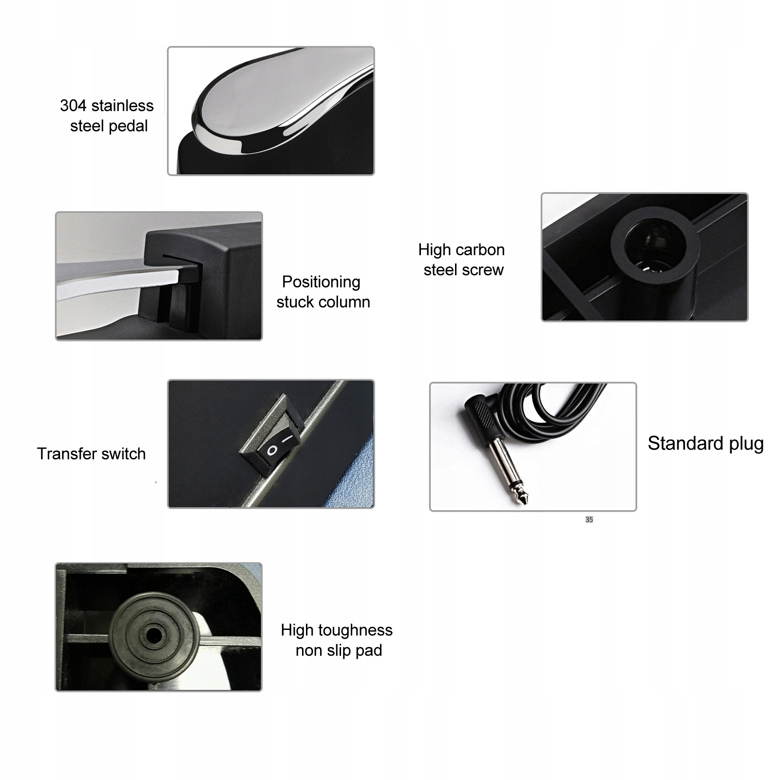 1. НАИЛЬНАЯ СОВМЕСТИМОСТЬ: на боковой стороне педали имеется переключатель полярности с входным разъемом 1/4 дюйма (6,35 мм), подходящий для различных фортепиано и клавишных инструментов.