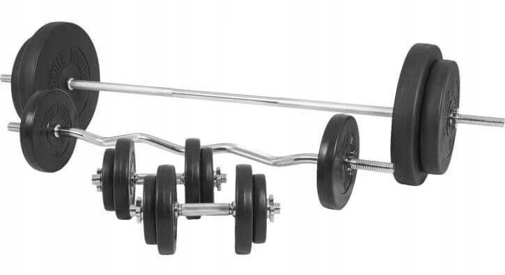 - Gryfy: 1 x 170 см (простой, 10 кг), 1 x 120 см (сломан, 8 кг), 2 x 35 см (2 x 2,5 кг)
