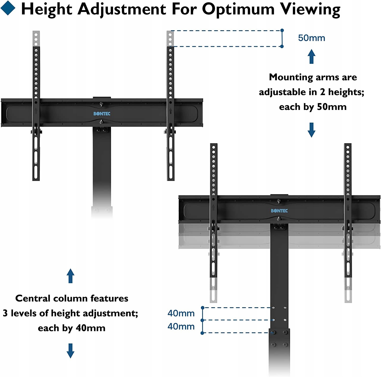 Поворот и регулировка по высоте — монтажный кронштейн поворачивается влево и вправо на 37°, обеспечивая широкий угол обзора; 6 уровней регулировки высоты в соответствии с различными требованиями к размеру телевизора или высоте сиденья, с тремя уровнями регулировки высоты центральной стойки, каждый на 4 см, и двумя уровнями регулировки высоты монтажных кронштейнов, каждый на 5 мм в высоту. отрегулировано на 50 мм