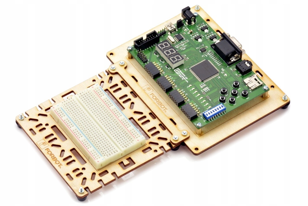 Универсальная фанерная подставка для комплекта разработки Elbert v2, используемого в курсе по основам ПЛИС FORBOT.