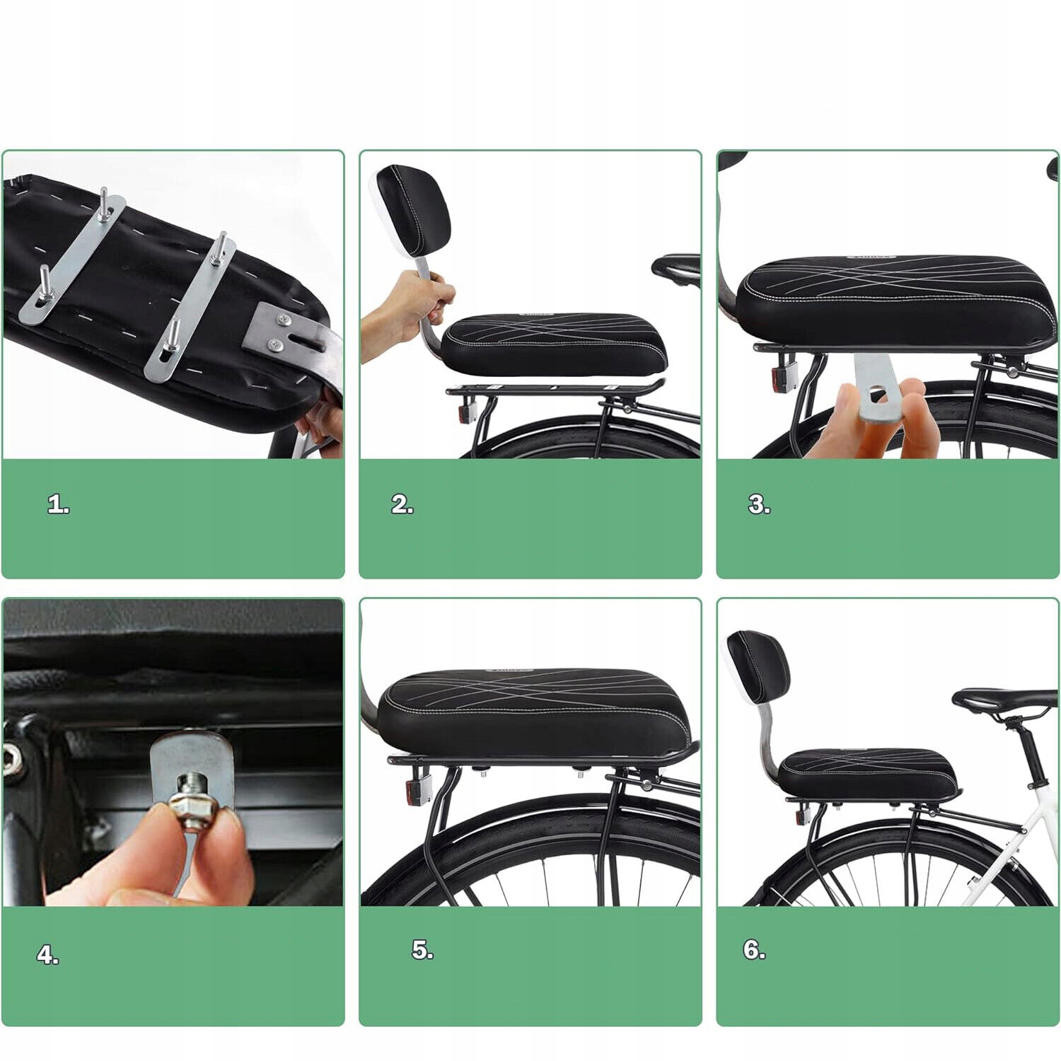 🚲🚲 Отличный материал: Эта велосипедная подушка сидень пена, которая очень мягкая и дышащая; Просторное мягкое сиденье и спинка обеспечивают удобную поездку; Поверхность PU хороша для ежедневной очистки и ухода. Поручни и педали изготовлены из нержавеющей стали, сплошной и долговечной. Отличные материалы обеспечивают высокое качество использования. Примечание: подходит для детей более 5 лет. Задняя велосипедная площадка обеспечивает безопасность для ребенка. Благодаря этому велосипедному аксессуару, дети могут сидеть и расслабиться, когда захотят. ; Чтобы завершить установку, необходима сплошная велосипедная рама с винтами; легко установить на большинство стандартных велосипедных рамок; Это идеальный велосипедный аксессуар