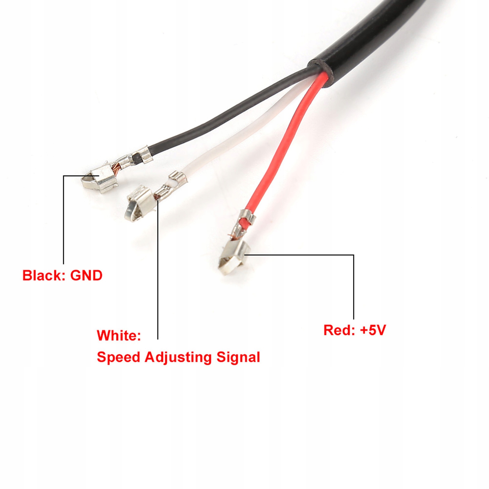 3 провода: +5 В (красный), сигнал управления скоростью (белый), GND (черный)
