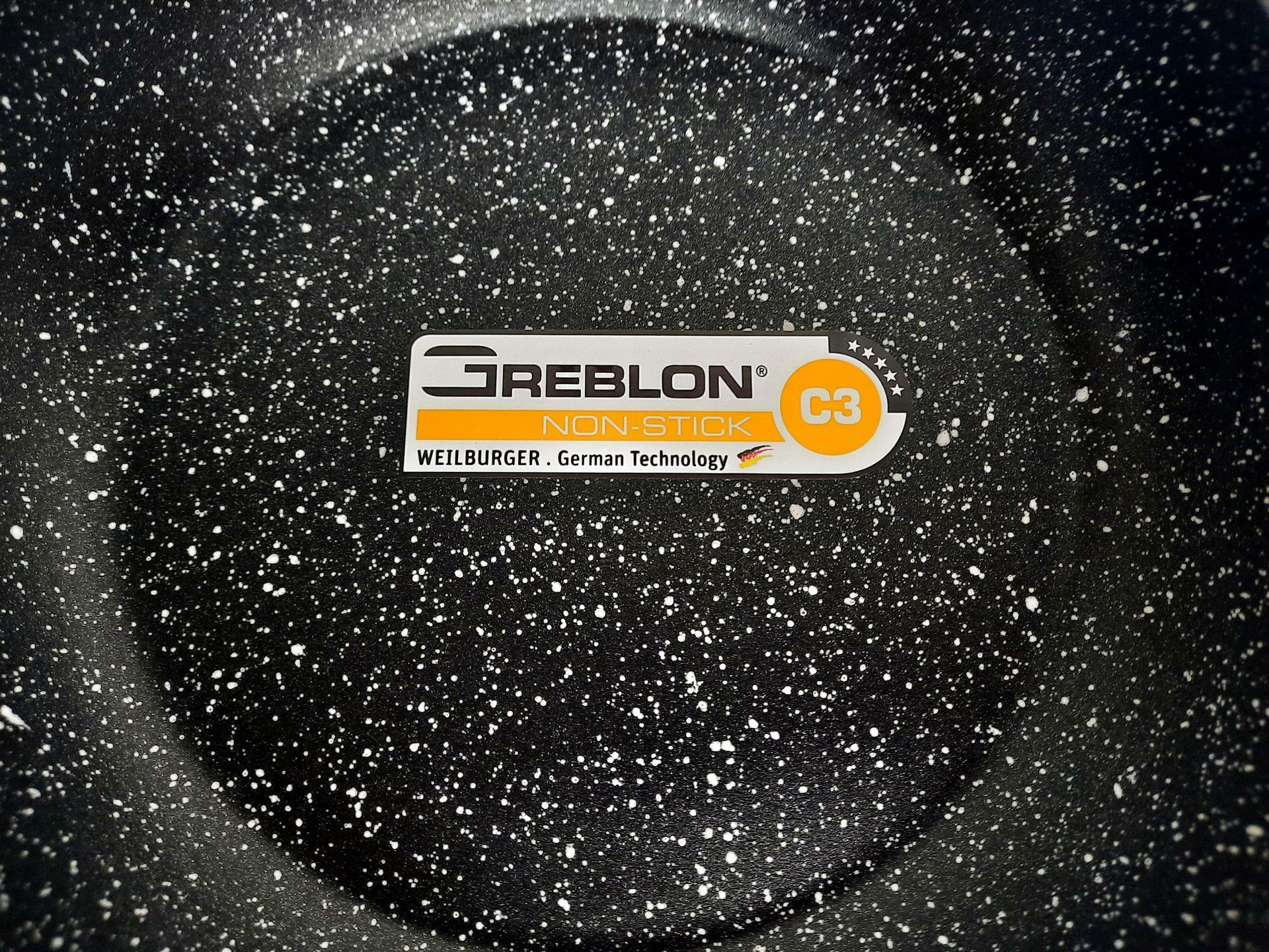 Инновационное 3-слойное антипригарное покрытие из ПТФЭ позволяет готовить с небольшим количеством масла или без него и без пригорания. Кроме того, наше покрытие не содержит ПФОК/АПЕО.