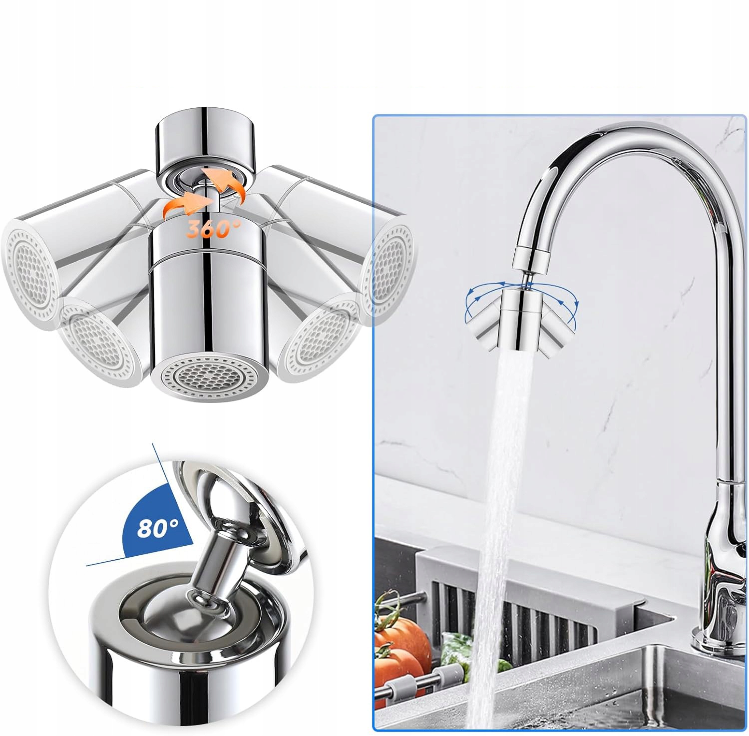 💦💦Вращение на 360 градусов: Максимальный угол вверх и вниз может достигать 80 градусов, а благодаря вращению на 360 градусов поток воды достигает всех углов раковины, что очень удобно для мытья и не скапливает грязь; Полный диапазон движений позволяет легко ополаскивать/чистить раковину, быстро очищая различные предметы в углах раковины и тем самым повышая эффективность уборки кухни.