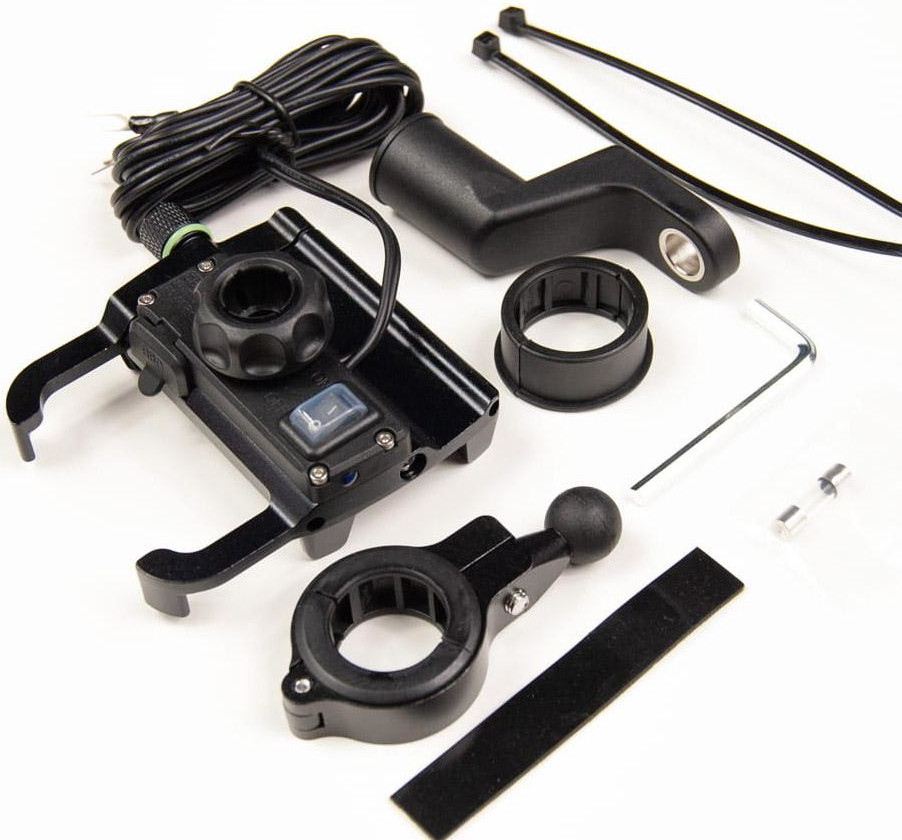 Возможность крепления держателя на руль или под винт зеркала делает его чрезвычайно универсальным и подходит для большинства мотоциклов.