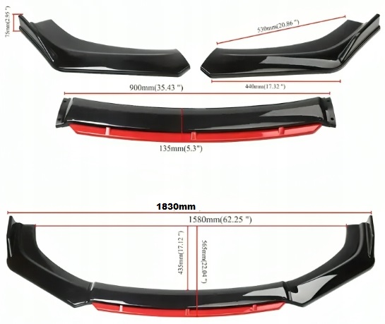 Универсальный передний бампер с 4 частями в черном (блеск) с красной вставкой, изготовленным из очень легкого и очень прочного материала ABS, устойчивого к погодным условиям.