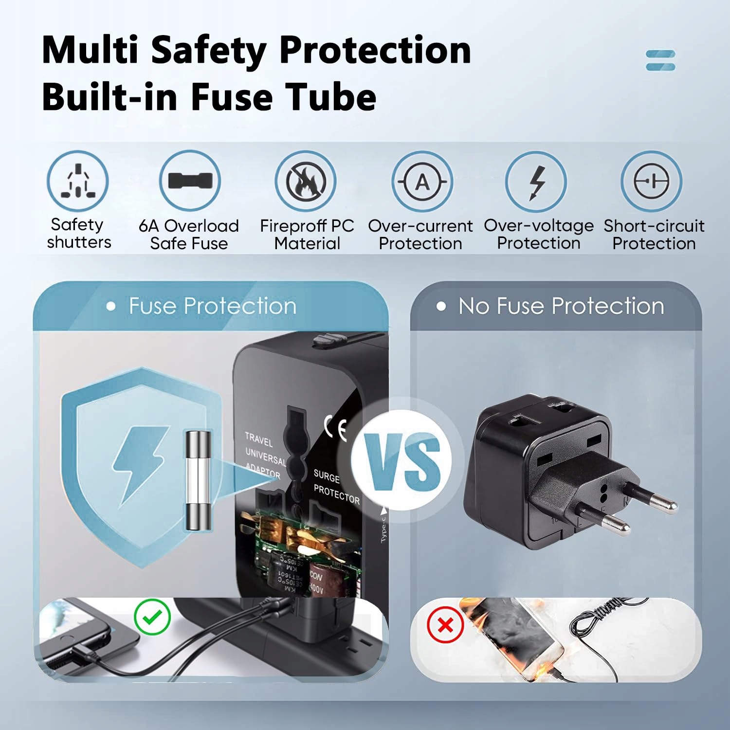 Travel Adapter с USB-C и USB-A Зарядные порты, универсальный адаптер путешествий, преобразователь питания сети, настенное зарядное устройство для США, ЕС, Великобритании, Аус. Подходит большинство биполярных гнезд. Это самый безопасный способ подключения мобильных устройств без заземления по всему миру. Universal Network Socket поддерживается американскими, европейскими, британскими, австралийскими и азиатскими плагинами. Совместим с различными типами входных розетков почти по всему миру