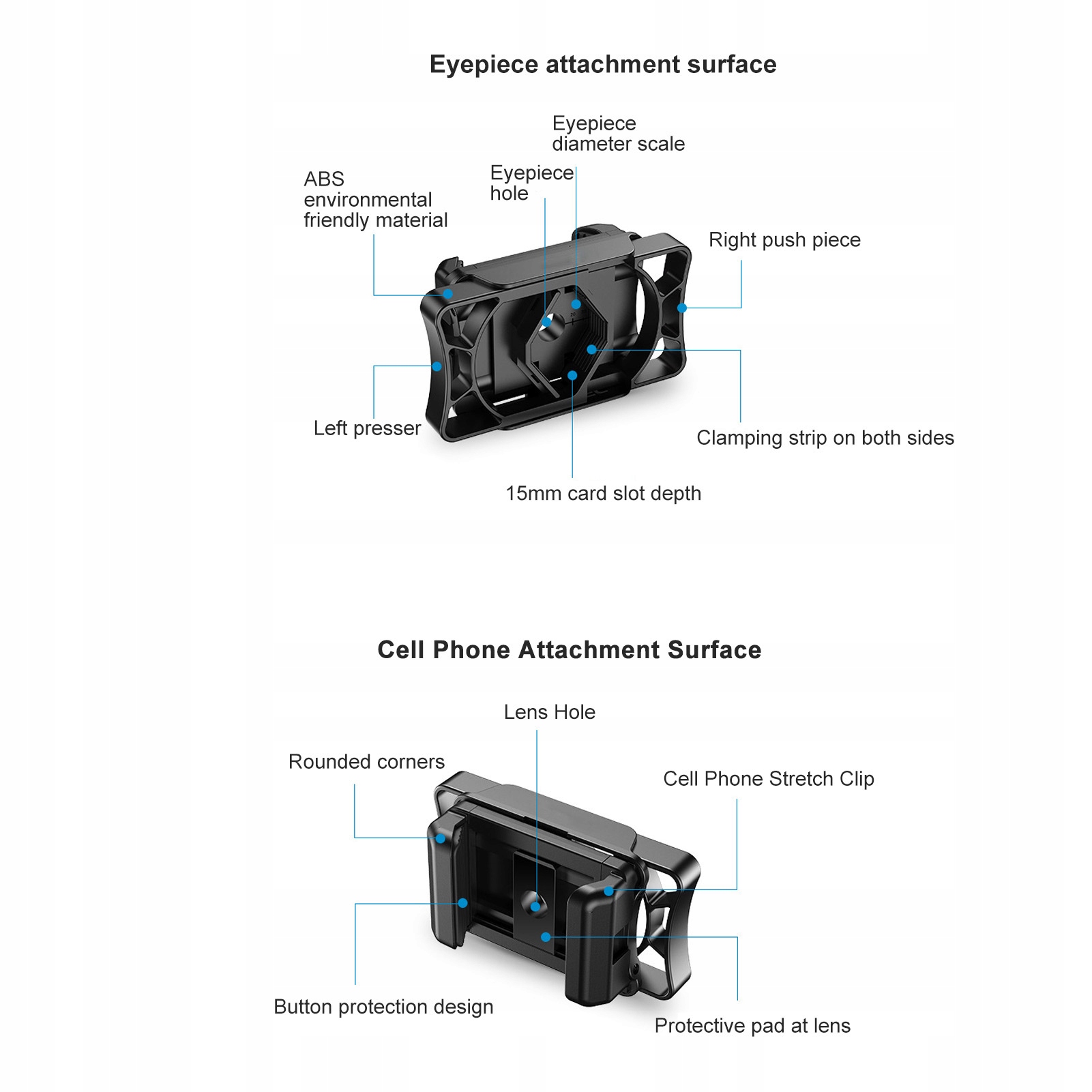 Как использовать: 1. Растягивайте растягивающий зажим, чтобы прикрепить его к мобильному телефону, переместите элемент регулировки, чтобы отрегулировать отверстие для глазного яблока в основной объектив мобильного телефона. (Совет: сложите телескоп очков и сложите крышку глазного яблока)