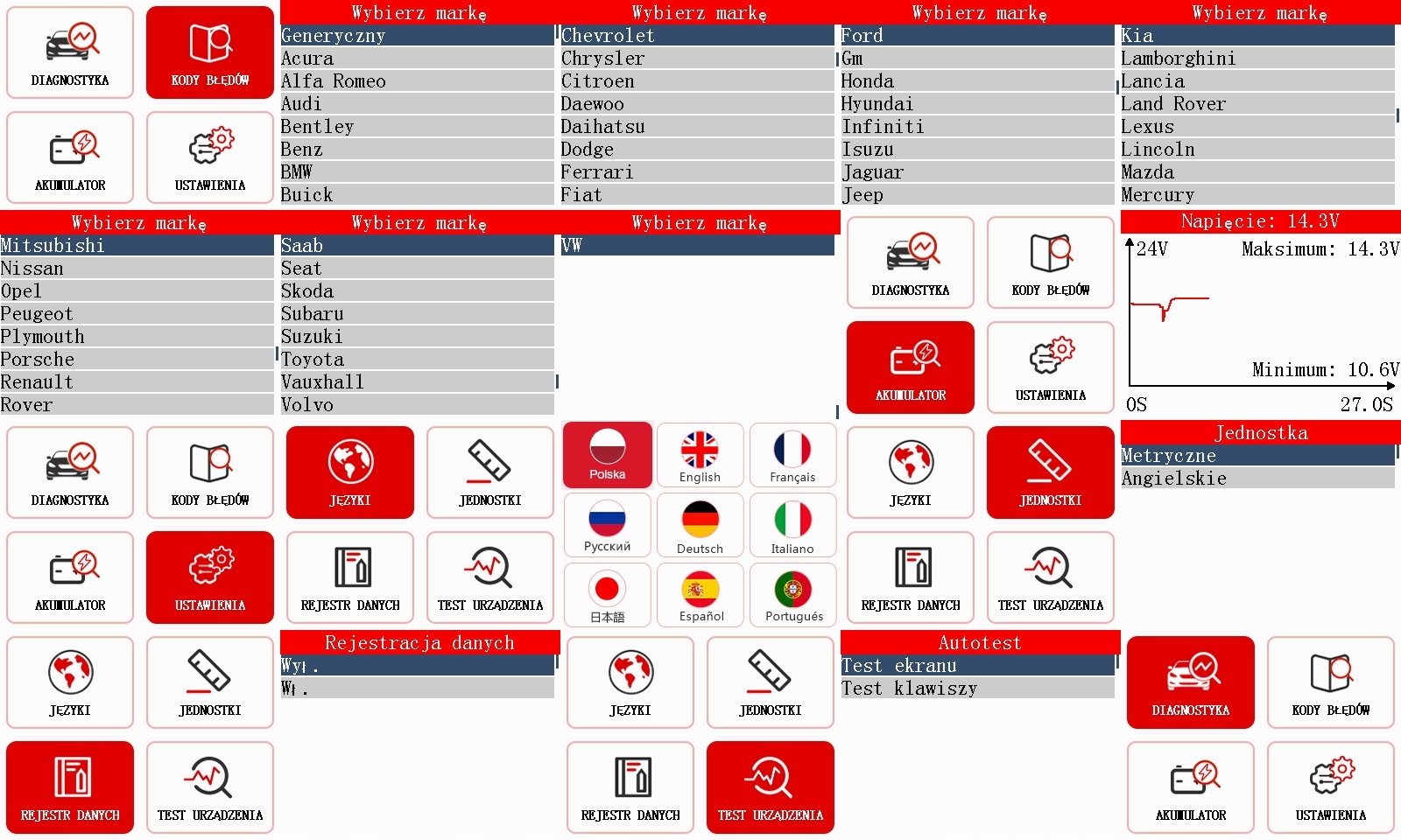 - Отображение Статусы мониторов , UDS и все другие протоколы стандарта OBD2. Выбрать : польский , английский, французский, русский, немецкий, итальянский, японский, испанский, португальский
