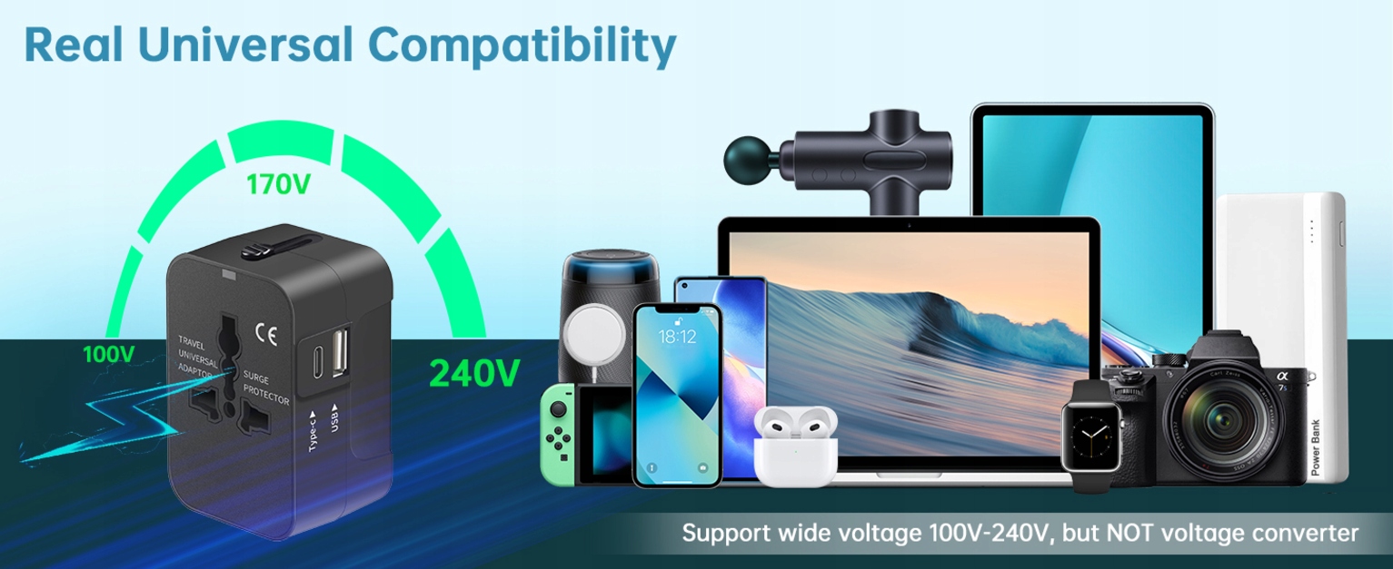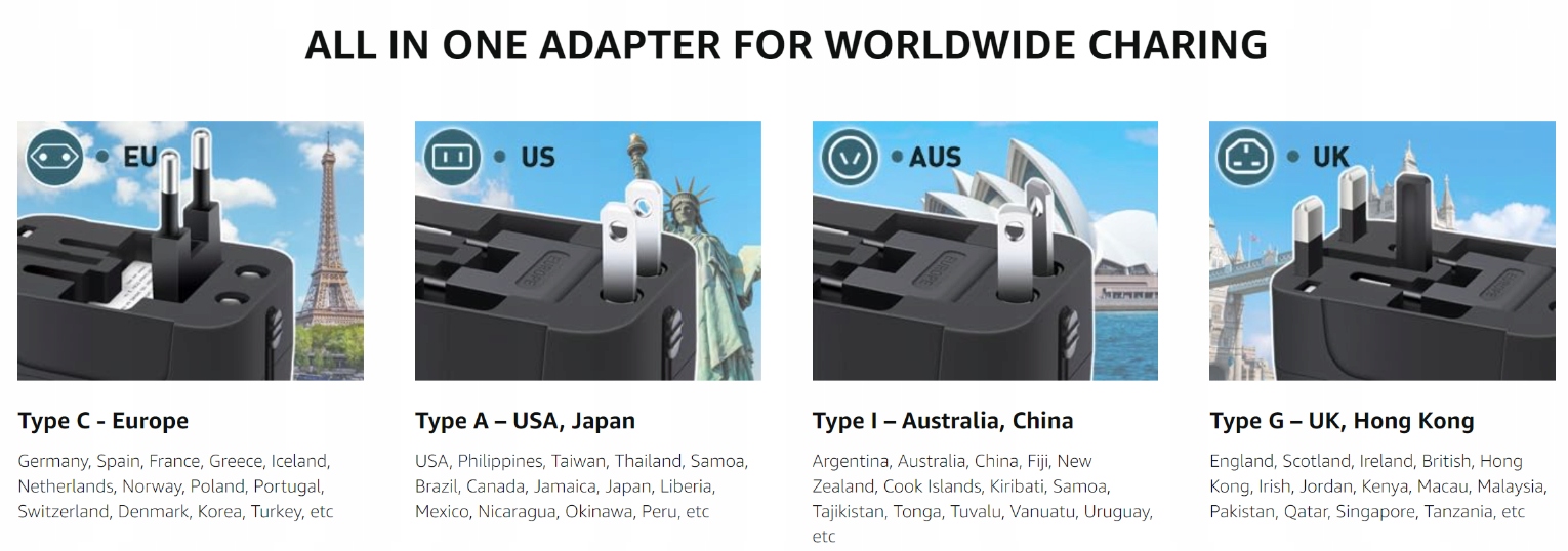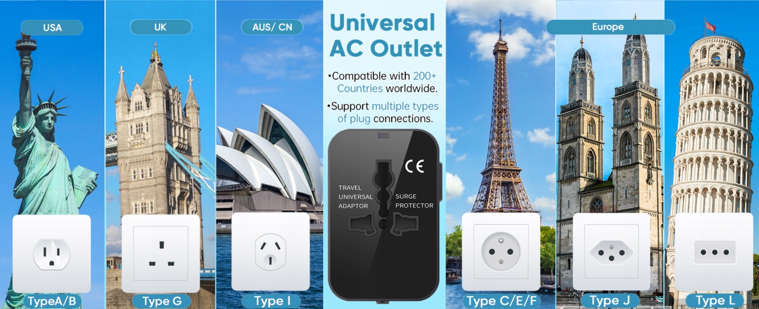 Travel Adapter с USB-C и USB-A Зарядные порты, универсальный адаптер путешествий, преобразователь питания сети, настенное зарядное устройство для США, ЕС, Великобритании, Аус. Подходит большинство биполярных гнезд. Это самый безопасный способ подключения мобильных устройств без заземления по всему миру. Universal Network Socket поддерживается американскими, европейскими, британскими, австралийскими и азиатскими плагинами. Совместим с различными типами входных розетков почти по всему миру