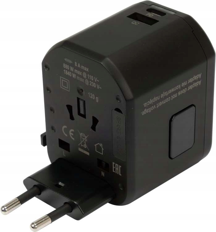 УНИВЕРСАЛЬНЫЙ ДОРОЖНЫЙ АДАПТЕР С ЗАРЯДНЫМ УСТРОЙСТВОМ USB QC QUICK. 3.0, PD USB-C, 5 В/3 А – 9 В/2 А – 12 В/1,5 А 18 Вт