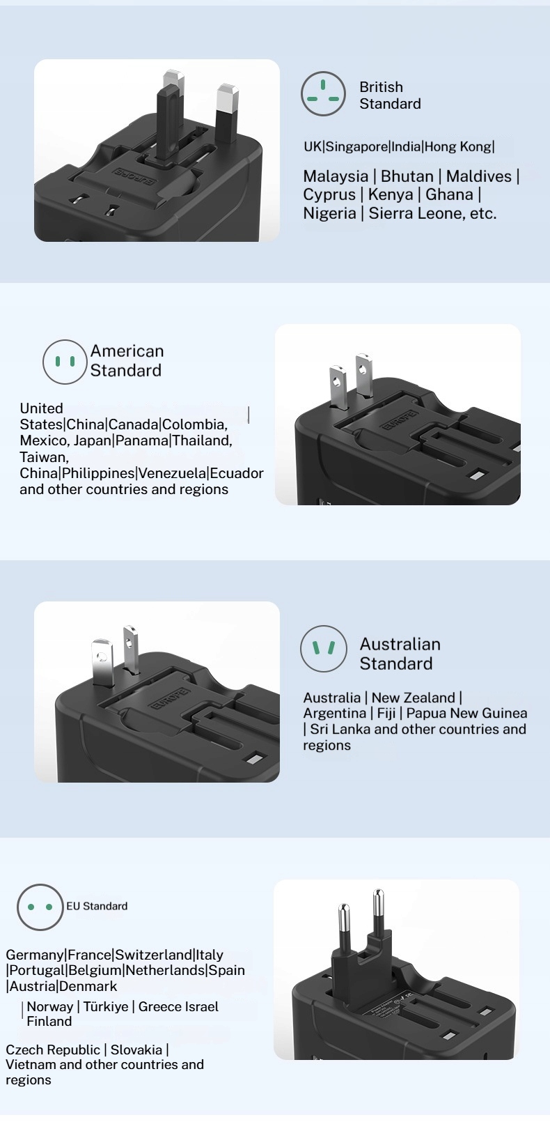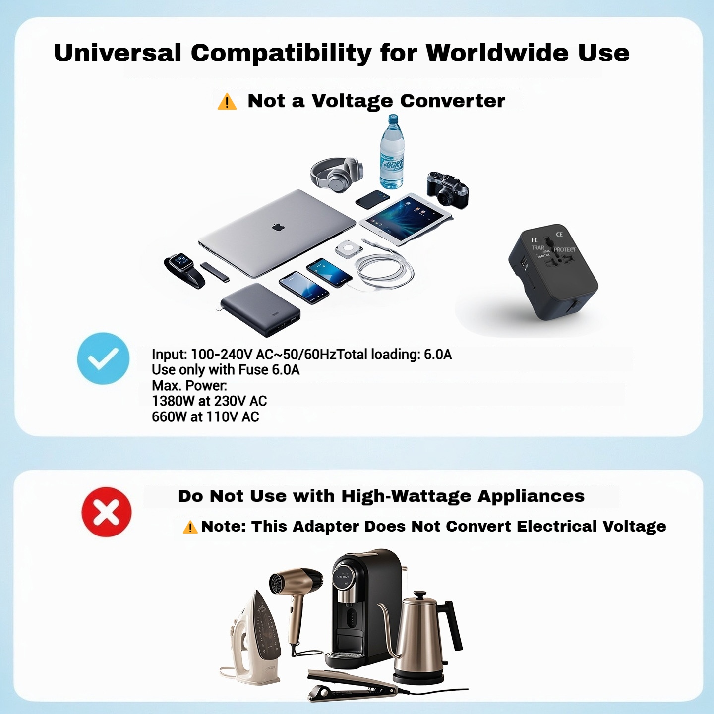 Наш универсальный адаптер для путешествий был разработан с учетом вашей безопасности. Он оснащен встроенным предохранителем и несколькими уровнями защиты, обеспечивающими безопасную и надежную зарядку для вас и вашей семьи.