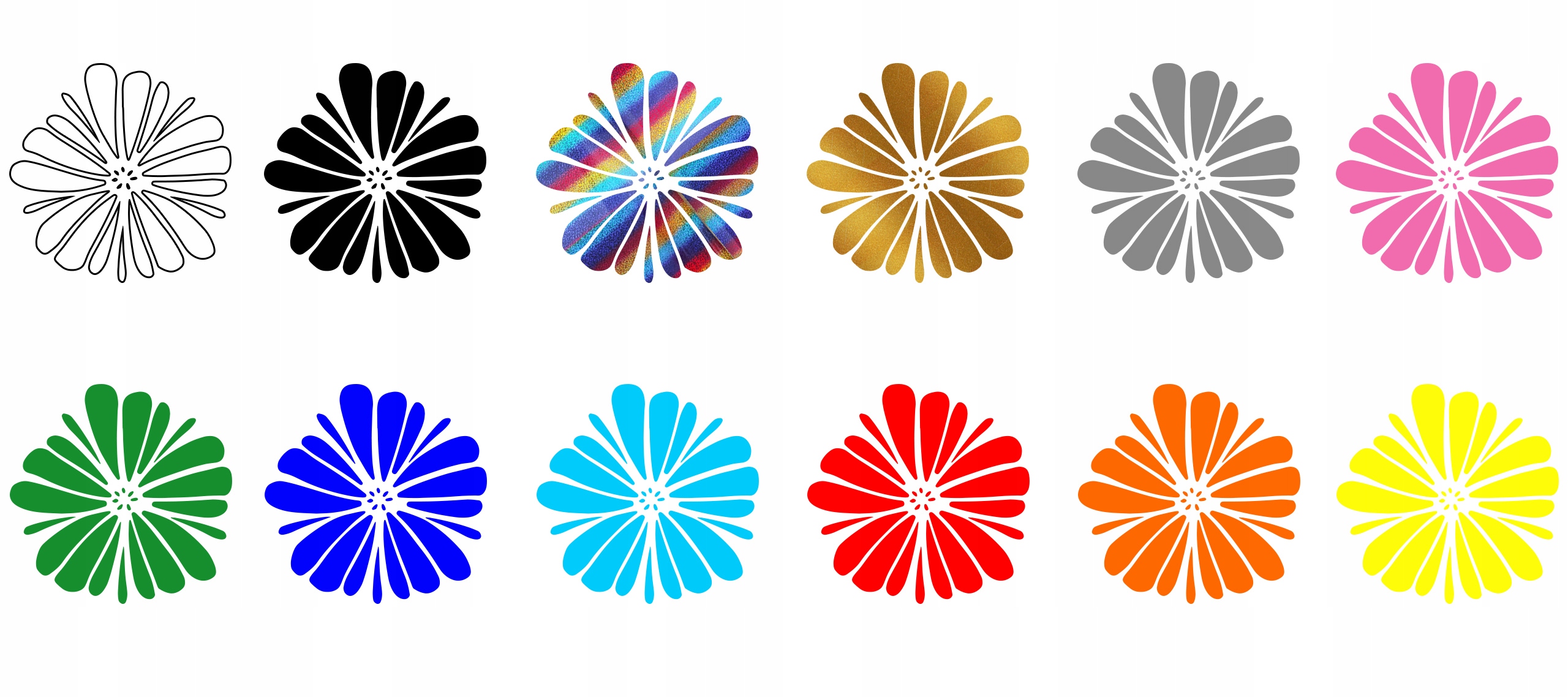 белый, черный, радужный (голограмма), золотой, серый, розовый, зеленый, синий, небесно-голубой, красный, оранжевый, желтый и блестящий
