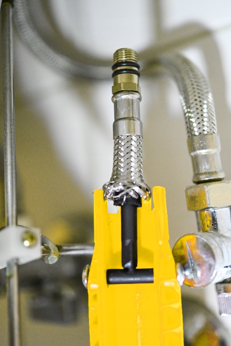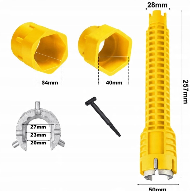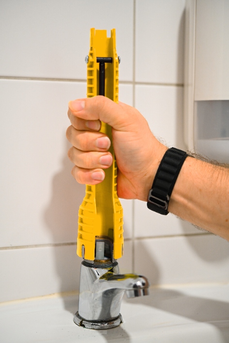 Он позволяет собирать или разбирать типичные гидравлические фитинги размером 1/2 дюйма и 3/4 дюйма, а также закрывать и открывать клапаны, отвинчивать и завинчивать различные гайки с крыльями или зубьями. С помощью этого инструмента можно монтировать или демонтировать водопроводные соединения к смесителям умывальника, ванны, кухни и унитаза, а также сами смесители. Ключ размещается на шлангах, поэтому можно работать в очень узких местах (куда традиционный рожковый ключ не помещается).