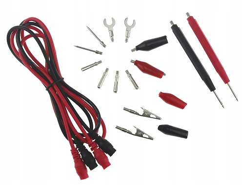В комплект входят различные измерительные насадки из латуни и стали, позволяющие проводить точные измерения в сложных условиях. Зажимы типа «крокодил» и штекеры типа «банан» повышают универсальность и позволяют использовать его в широком спектре измерительных устройств. Комплект отличается высоким уровнем безопасности в соответствии со стандартом 1000В CAT III.