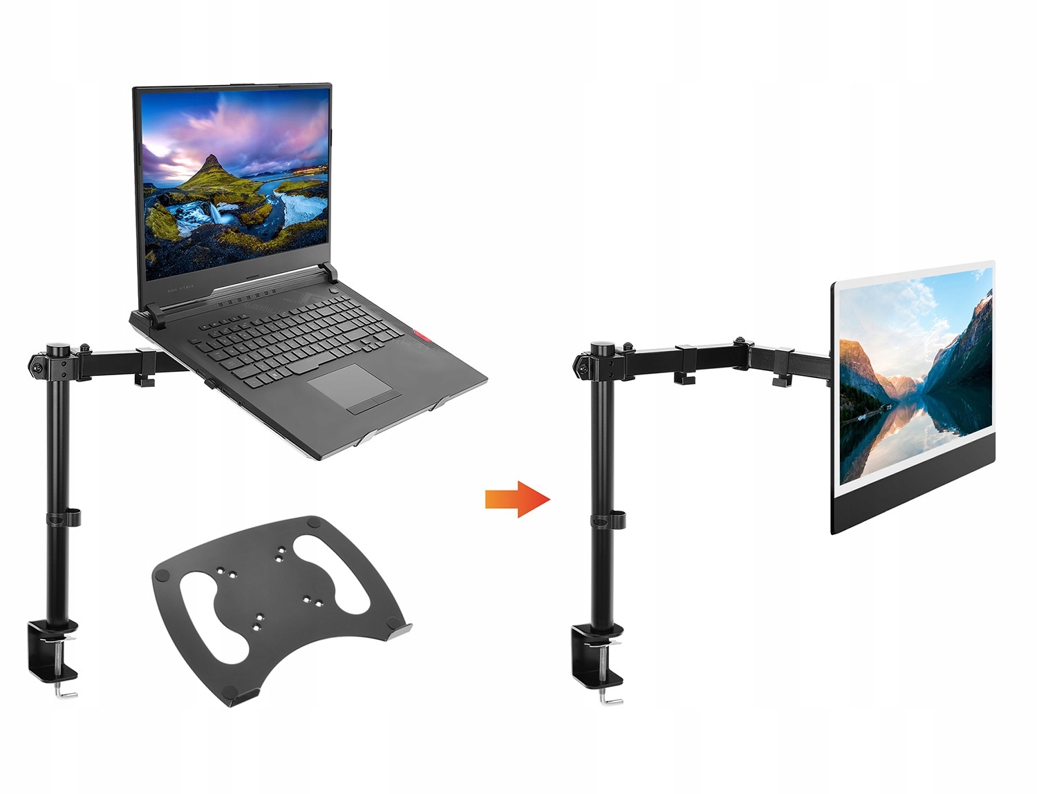 Комплект В комплект входит настольный держатель для монитора + подставка для ноутбука, поэтому вы можете использовать его как держатель для ноутбука (добавив подставку) или монитора (без подставки).