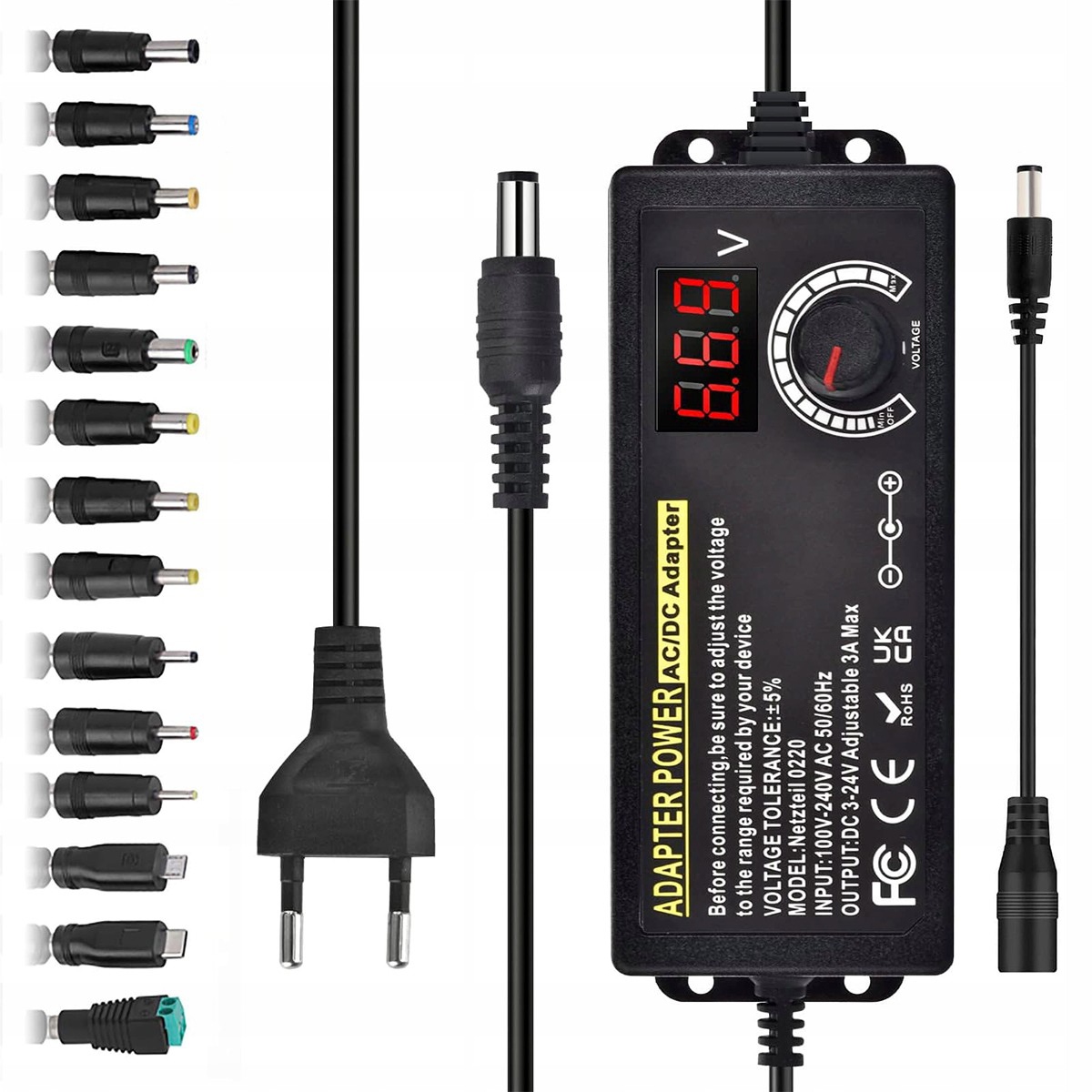 Вход: 100 ~ 240 В переменного тока, 50/60 Гц, выходное напряжение 3 В ~ 24 В постоянного тока, регулируемое. Максимальная мощность 3А, 72Вт; может подавать ток ниже 3 А, напр. 300 мА, 500 мА, 1 А, 1,5 А, 2 А, 2,5 А, 3 А. Измеренное выходное напряжение между 2,85 В и 25,2 В находится в пределах стандартного диапазона и является правильным, с отраслевым допуском плюс/минус 5%. Прежде чем подключать изделие, убедитесь, что оно совместимо с диапазоном напряжения вашего устройства.