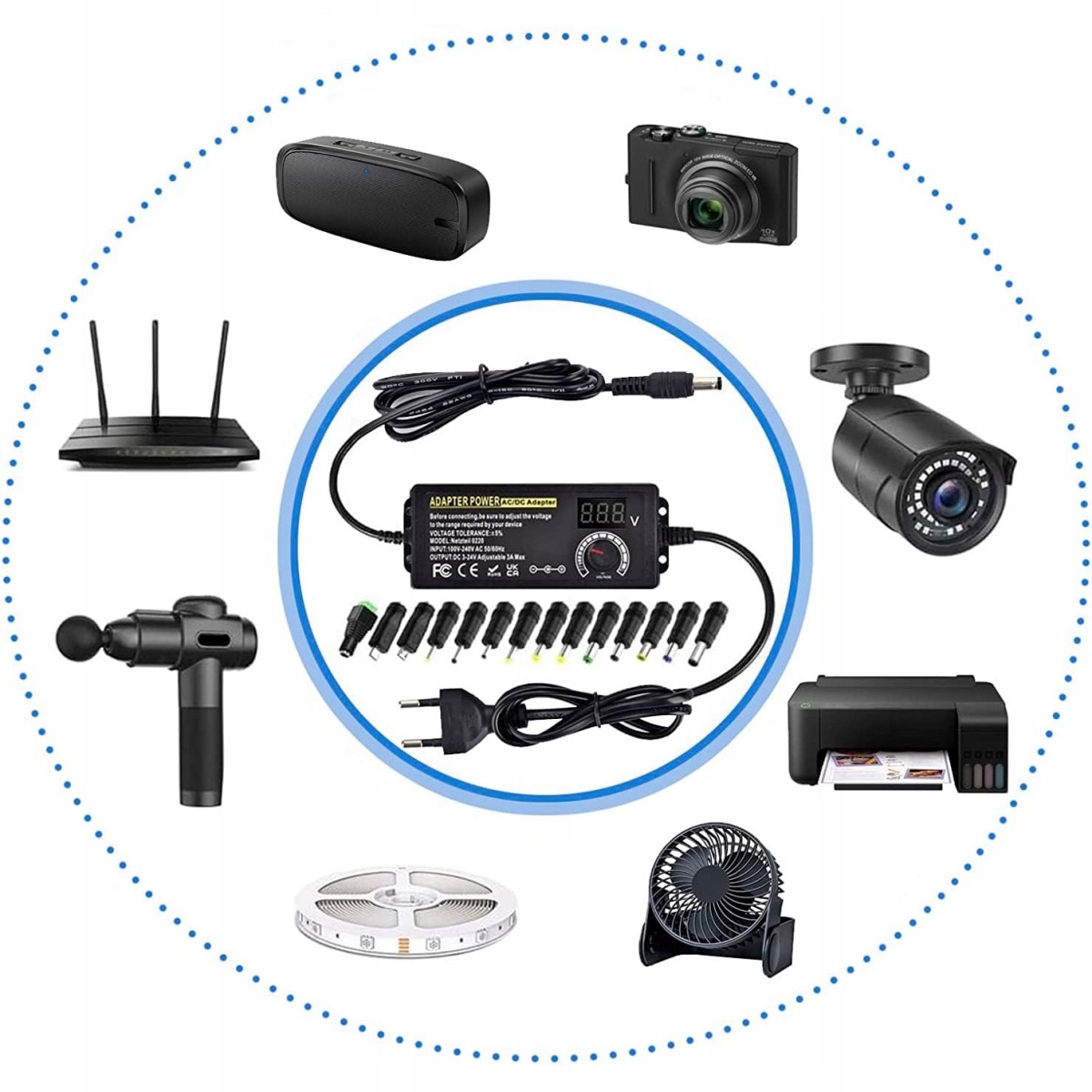Источник питания 3 В~24 В, 3 А, 72 Вт. Этот универсальный источник питания переменного/постоянного тока мощностью 72 Вт подходит для питания линейных двигателей постоянного тока, водяных насосов постоянного тока, светодиодных лент, освещения под шкафом, ТВ-приставок, маршрутизаторов Wi-Fi и другой бытовой техники, диффузоров эфирных масел, увлажнителей воздуха, USB-вентиляторов, камер Wi-Fi, USB-концентраторы, декодеры жестких дисков, цифровые пианино, системы мониторинга DVR/NVR и т. д., а также другие устройства с потребляемой мощностью менее 72 Вт. Блок питания не следует использовать для зарядки устройств с батарейным питанием, так как это может привести к повреждению аккумулятора.