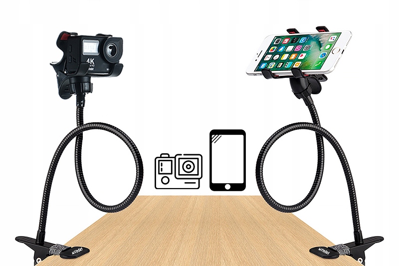 ✅ Дополнено двумя застежками: Большая, крепится к столешнице, отделывается противоскользящей губкой, и меньшая, устанавливается на подвижную застежку. головка, отделанная нескользящей резиной с дополнительными выступами, которые надежно удерживают телефон или камеру.