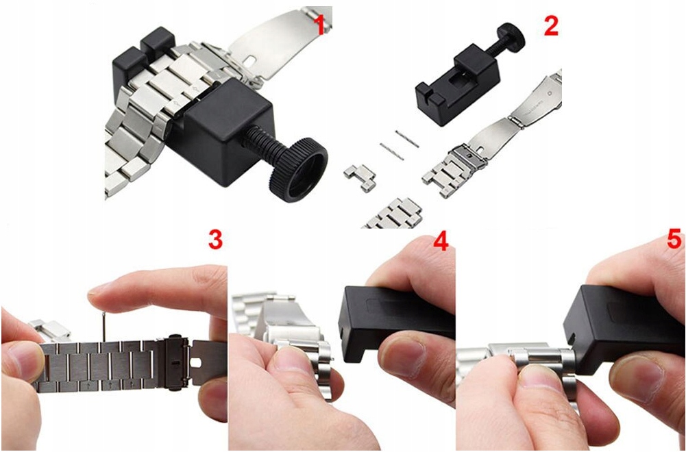- возможность укорачивания браслетапутем удаления звеньев в браслете благодаря устройству, входящему в комплект