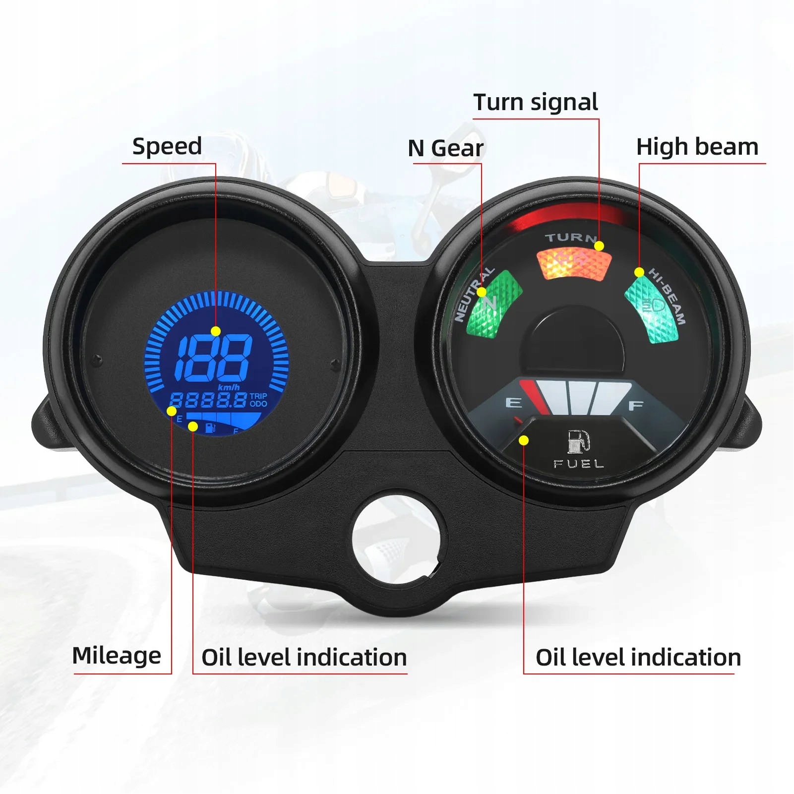 Функция: 1. Мониторинг одежды: цифровой ЖК -экран обеспечивает точную и отображающую скорость, пробег и топливо в режиме реального времени, предоставляя четкую информацию, повышая безопасность водителя во время поездок.