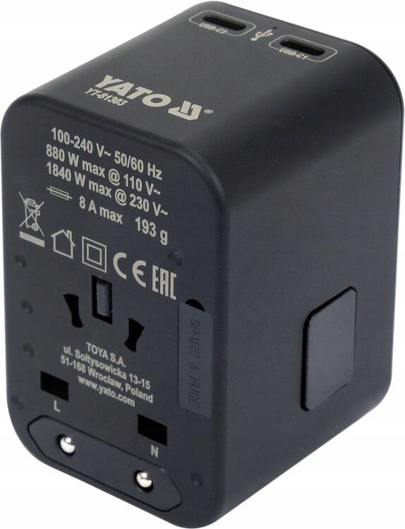 Yato YT-81303 Универсальный дорожный адаптер USB USB-C 65 Вт