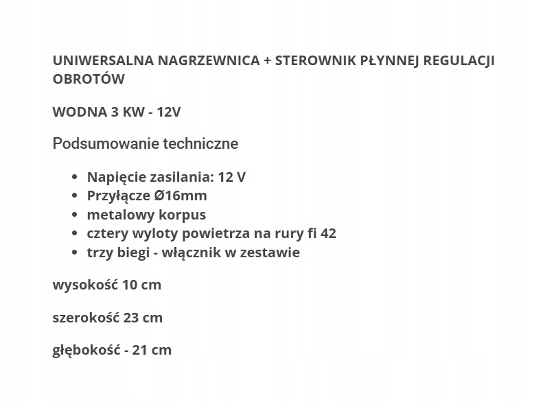UNIWERSALNA NAGRZEWNICA WODNA Z PŁYNNYM REGULATOREM GREG-CAR 3 KW 12 v