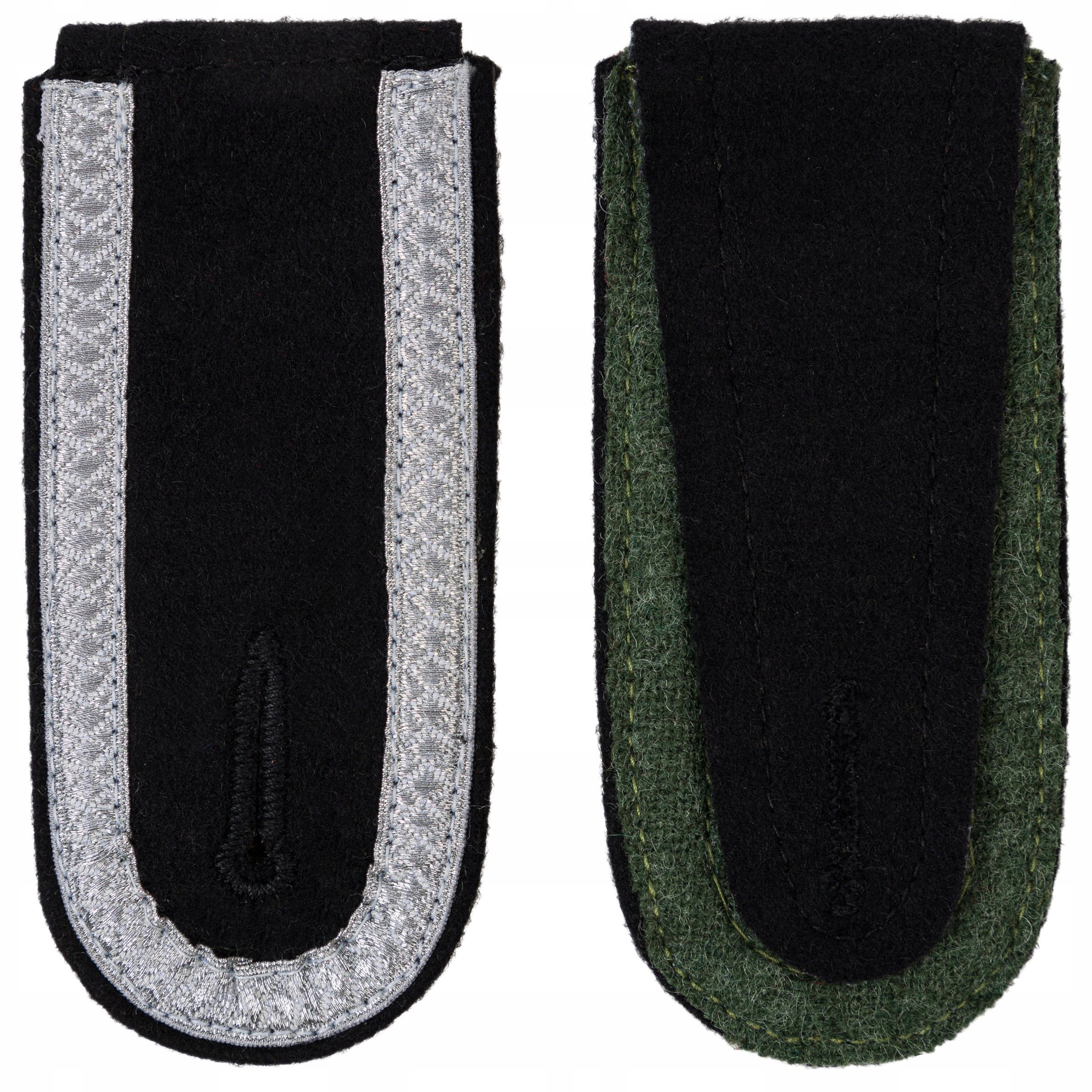 Точная копия погон унтер-офицеров звания унтершарфюрер. Погоны выполнены из черной ткани, кайма – из натуральной шерсти. Погоны обшиты унтер-офицерской тесьмой - идеальная реплика, соответствует оригиналу.Погоны имеют черный обод (пионерский).