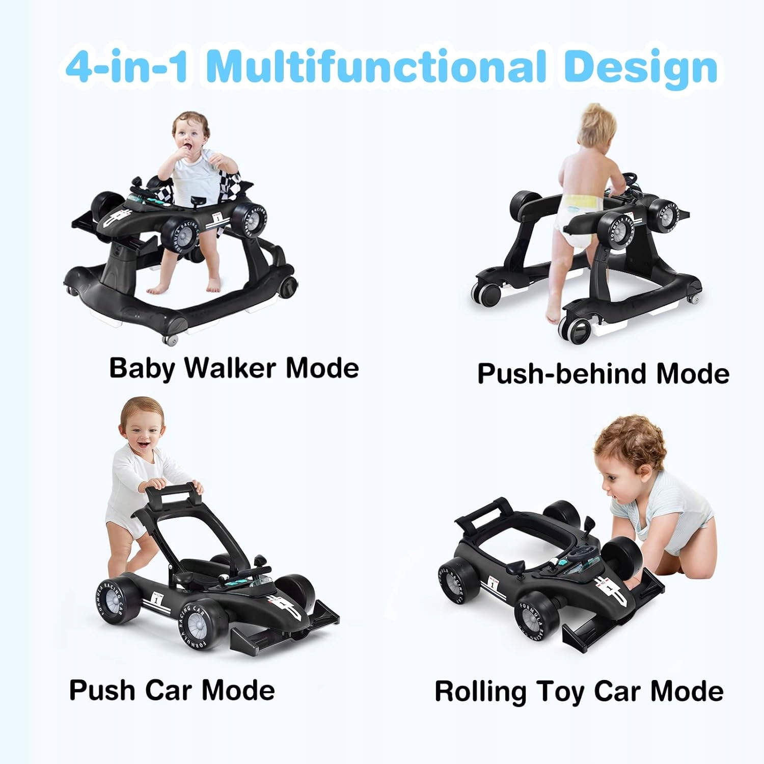 Уокер для детей 4 в 1, регулируемый рост со светом и музыкой, черный